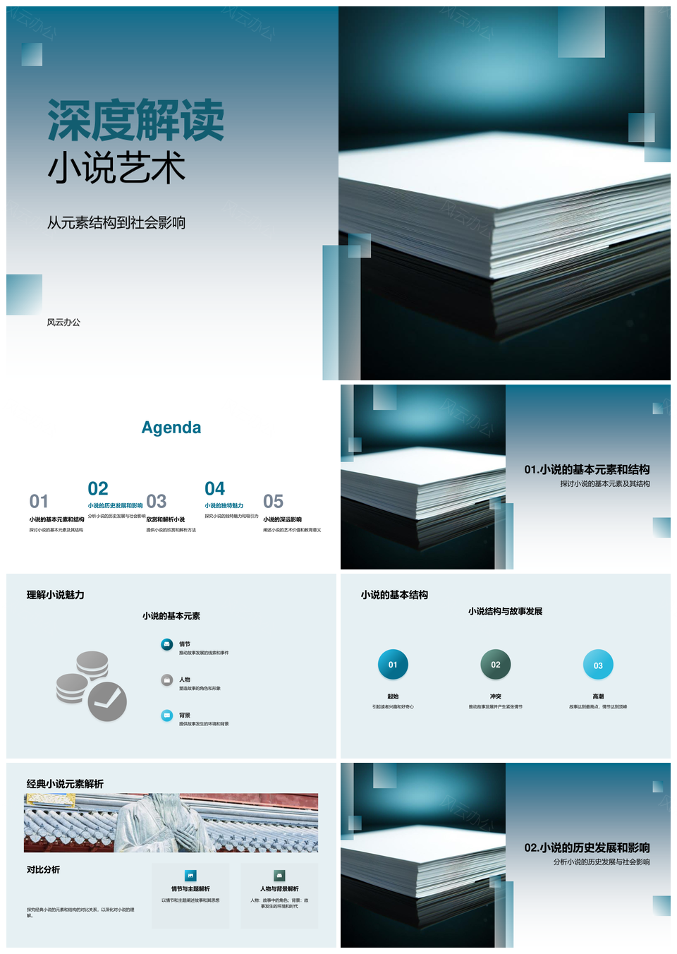 风云办公提供的经典小说艺术元素结构社会影响解析PPT模板,下载格式为pptx,一共23页,作品中文字及图均可以修改和编辑,图片更改请在作品中右键图片并更换,文字修改请直接点击文字进行修改。