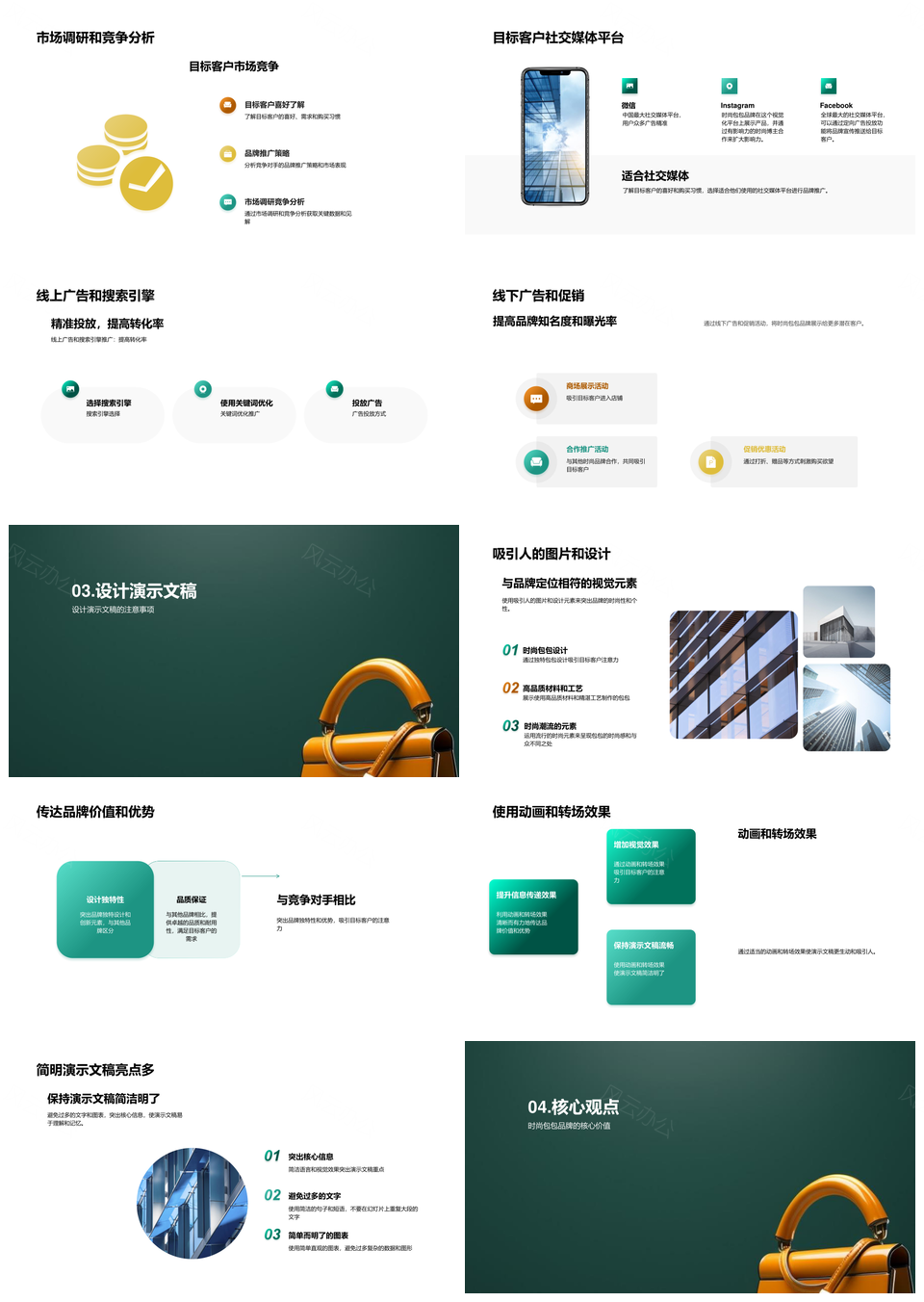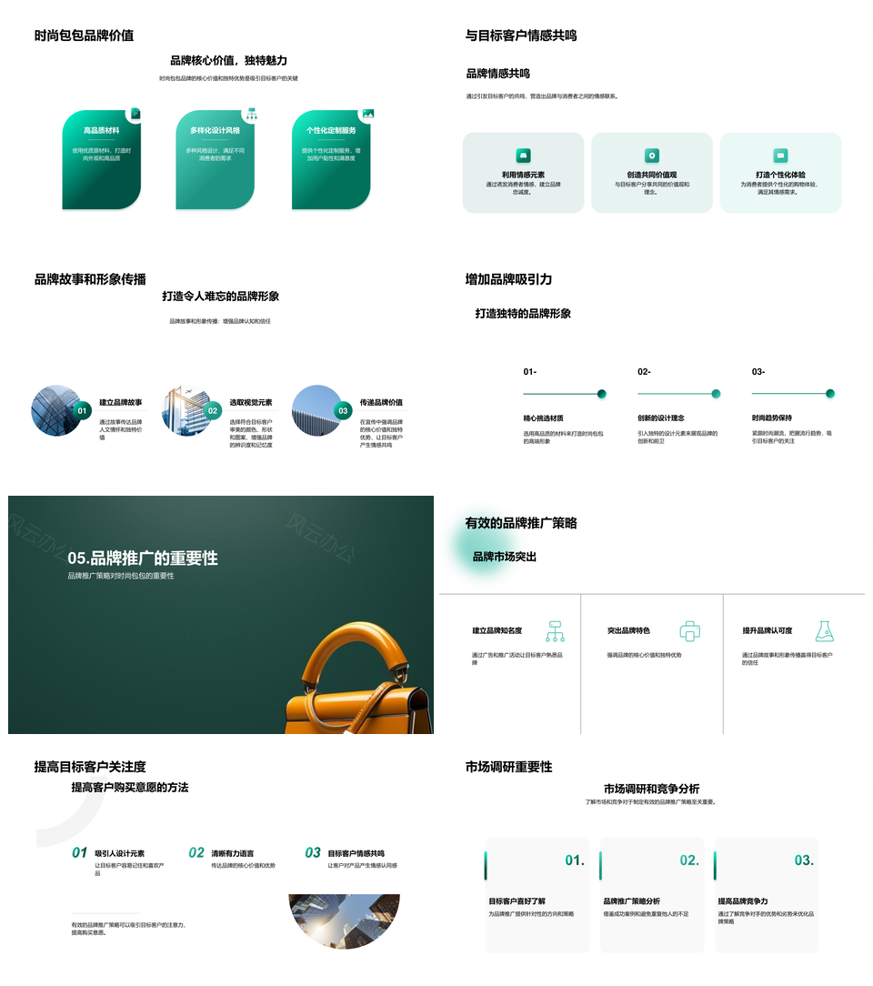 商务演示工具应兼具专业内核与视觉张力,这套模板以咖啡棕、墨绿为基底,融入浅绿渐变与橙色点睛,平衡理性与创新气质。逻辑框架严格遵循金字塔原理,目录导航、过渡页与图表模块均提供标准化架构,适配产品提案、行业分析等深度场景。图形库包含130+枚商务图标,涵盖金融、科技、教育等六大领域,支持一键配色匹配。页面留白与分栏设计精准把控信息密度,视觉层次分明,确保汇报逻辑透明化呈现。主色系通过Pantone认证,印刷场景下色差可控,兼顾屏幕演示与纸质材料输出需求。