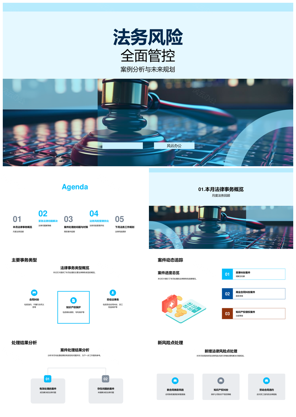 风云办公提供的法务风险管控案例分析未来规划法槌PPT模板,下载格式为pptx,一共28页,作品中文字及图均可以修改和编辑,图片更改请在作品中右键图片并更换,文字修改请直接点击文字进行修改。
