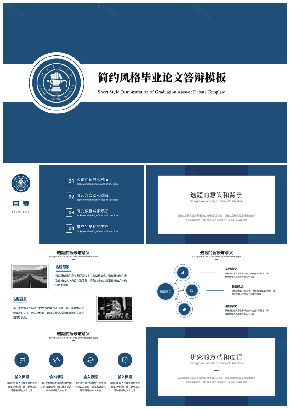 风云办公提供的蓝色毕业论文答辩简约学术风格通用PPT模板,下载格式为pptx,一共19页,作品中文字及图均可以修改和编辑,图片更改请在作品中右键图片并更换,文字修改请直接点击文字进行修改。