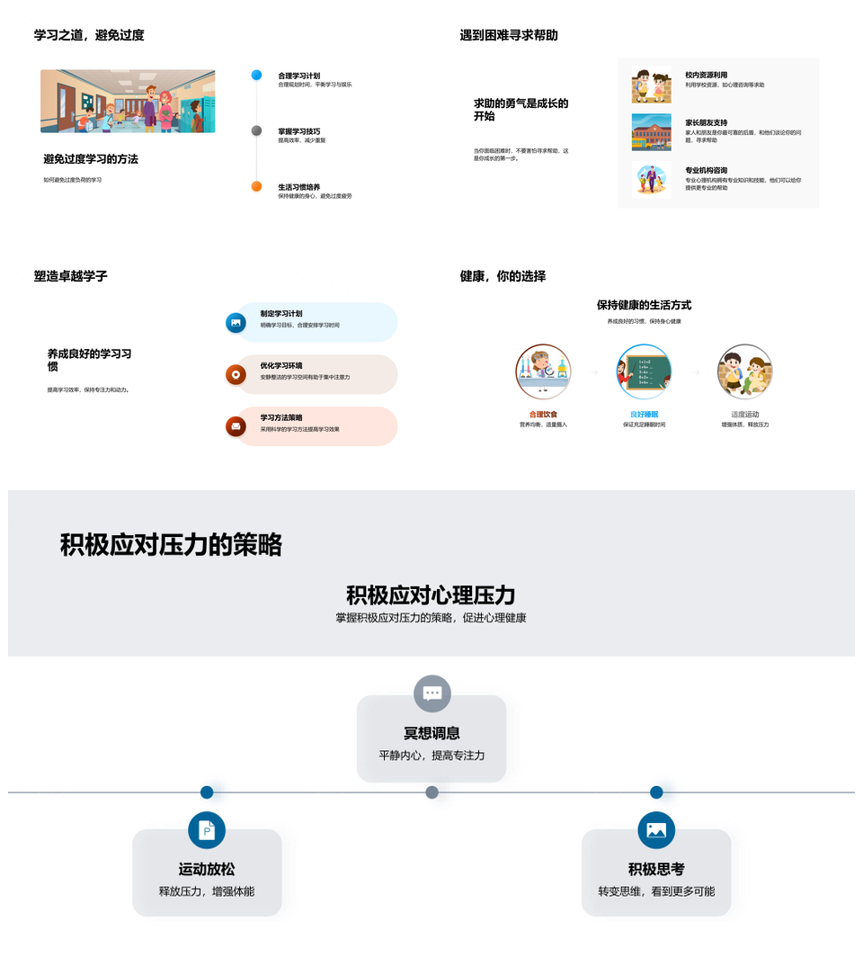 这是一张高二压力心理调适运动冥想积极思考助成长PPT模板,包含高二、压力、心理调适、运动、冥想、积极思考、成长等主题内容,也可用作高二压力心理调适、压力心理调适运动、心理调适运动冥想、调适运动冥想积极、运动冥想积极思考、冥想积极思考成长、压力心理调适、心理调适运动、调适运动冥想、运动冥想积极、冥想积极思考、积极思考成长、高二压力、心理调适、运动冥想等PPT场景使用。 风云办公提供的高二压力心理调适运动冥想积极思考助成长PPT模板,下载格式为pptx,一共33页,作品中文字及图均可以修改和编辑,图片更改请在作品中右键图片并更换,文字修改请直接点击文字进行修改。