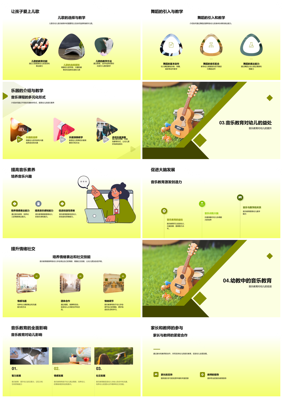 风云办公提供的幼儿音乐教育成长乐器素养实践之旅PPT模板,下载格式为pptx,一共23页,作品中文字及图均可以修改和编辑,图片更改请在作品中右键图片并更换,文字修改请直接点击文字进行修改。