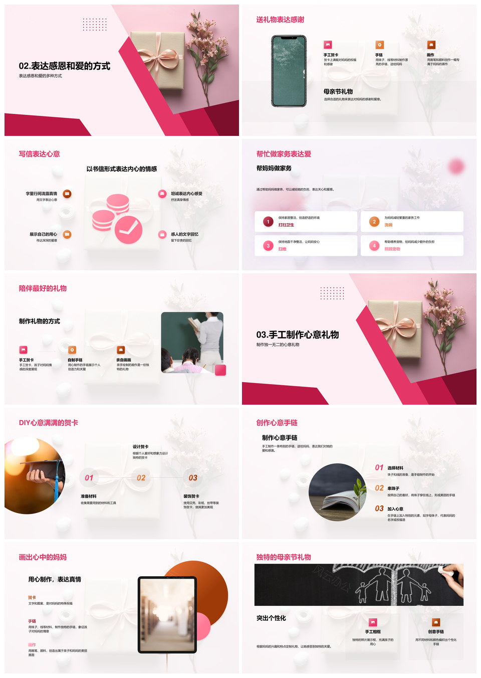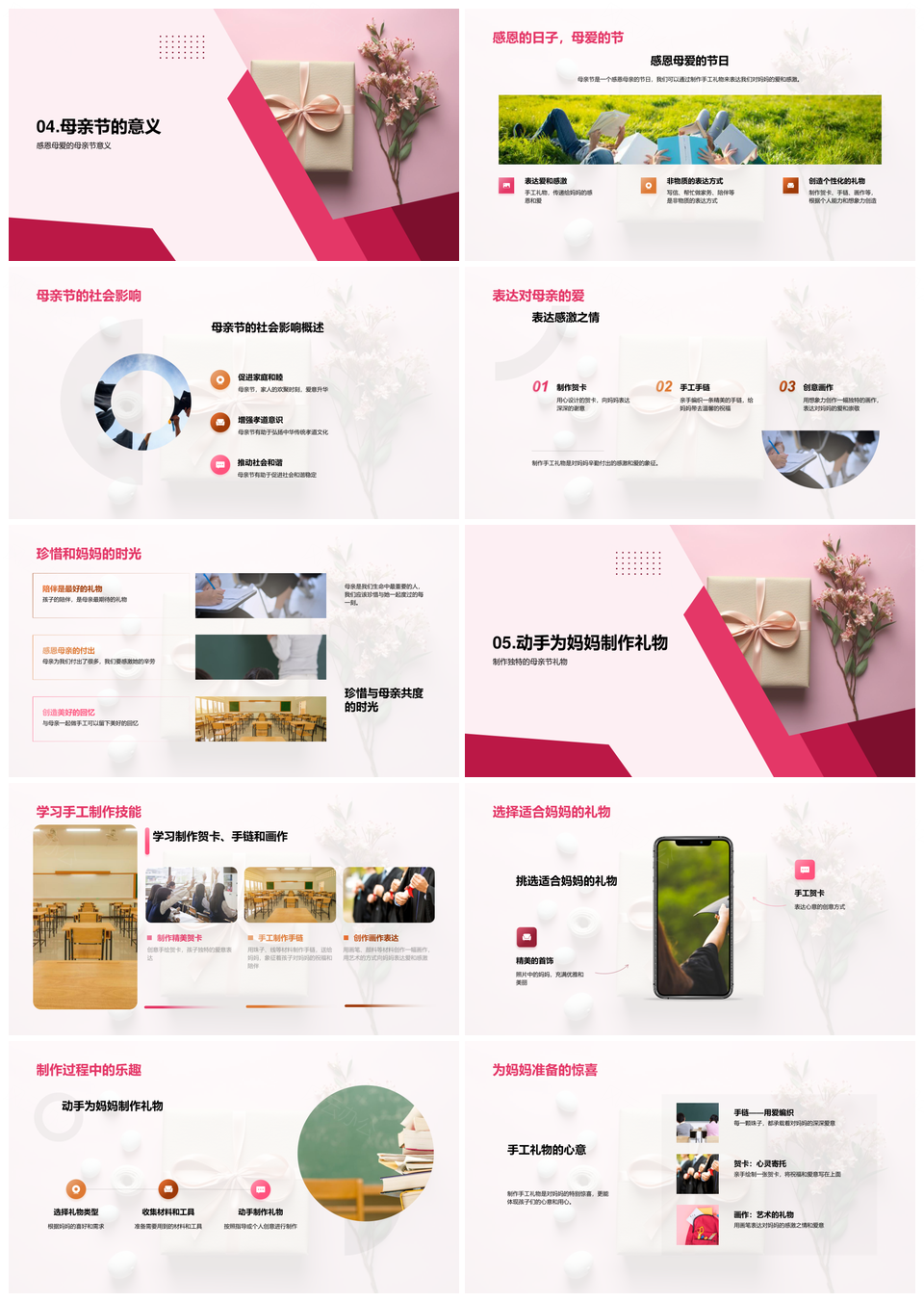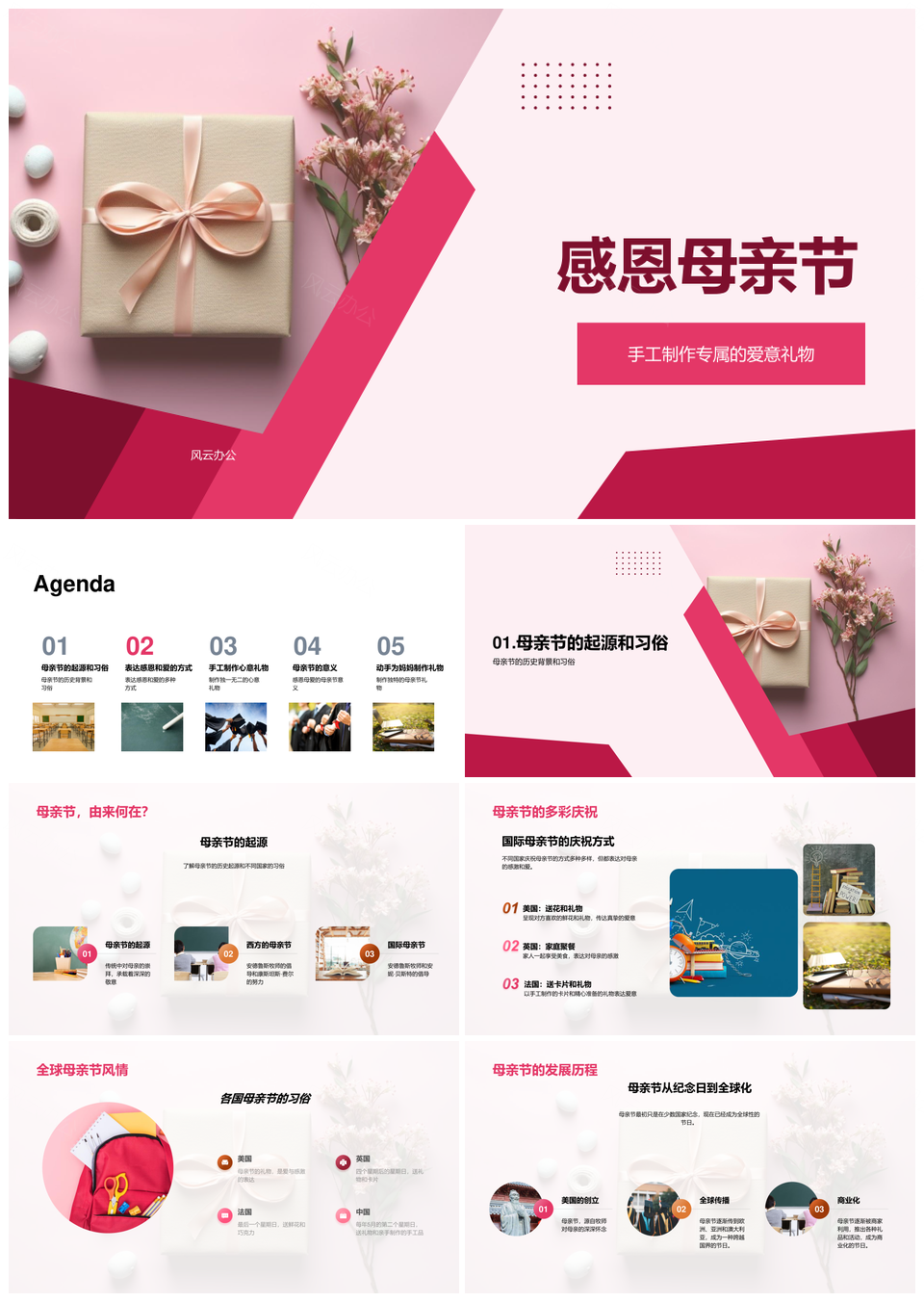 风云办公提供的母亲节手工礼贺卡手链感恩历史习俗PPT模板,下载格式为pptx,一共28页,作品中文字及图均可以修改和编辑,图片更改请在作品中右键图片并更换,文字修改请直接点击文字进行修改。