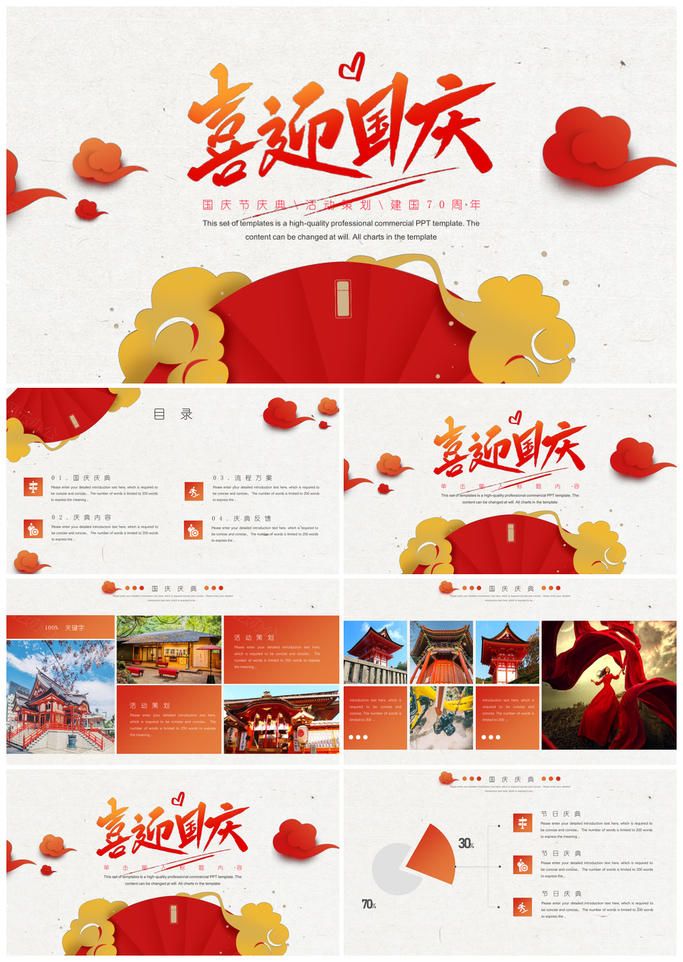 这是一张红色喜迎国庆活动策划书营销PPT模板,包含红色、喜迎、国庆、活动、策划书、营销等主题内容,也可用作红色喜迎国庆活动、喜迎国庆活动策划书、国庆活动策划书营销、红色喜迎国庆、喜迎国庆活动、国庆活动策划书、活动策划书营销、红色喜迎、喜迎国庆、国庆活动、活动策划书、策划书营销等PPT场景使用。 风云办公提供的红色喜迎国庆活动策划书营销PPT模板,下载格式为pptx,一共15页,作品中文字及图均可以修改和编辑,图片更改请在作品中右键图片并更换,文字修改请直接点击文字进行修改。