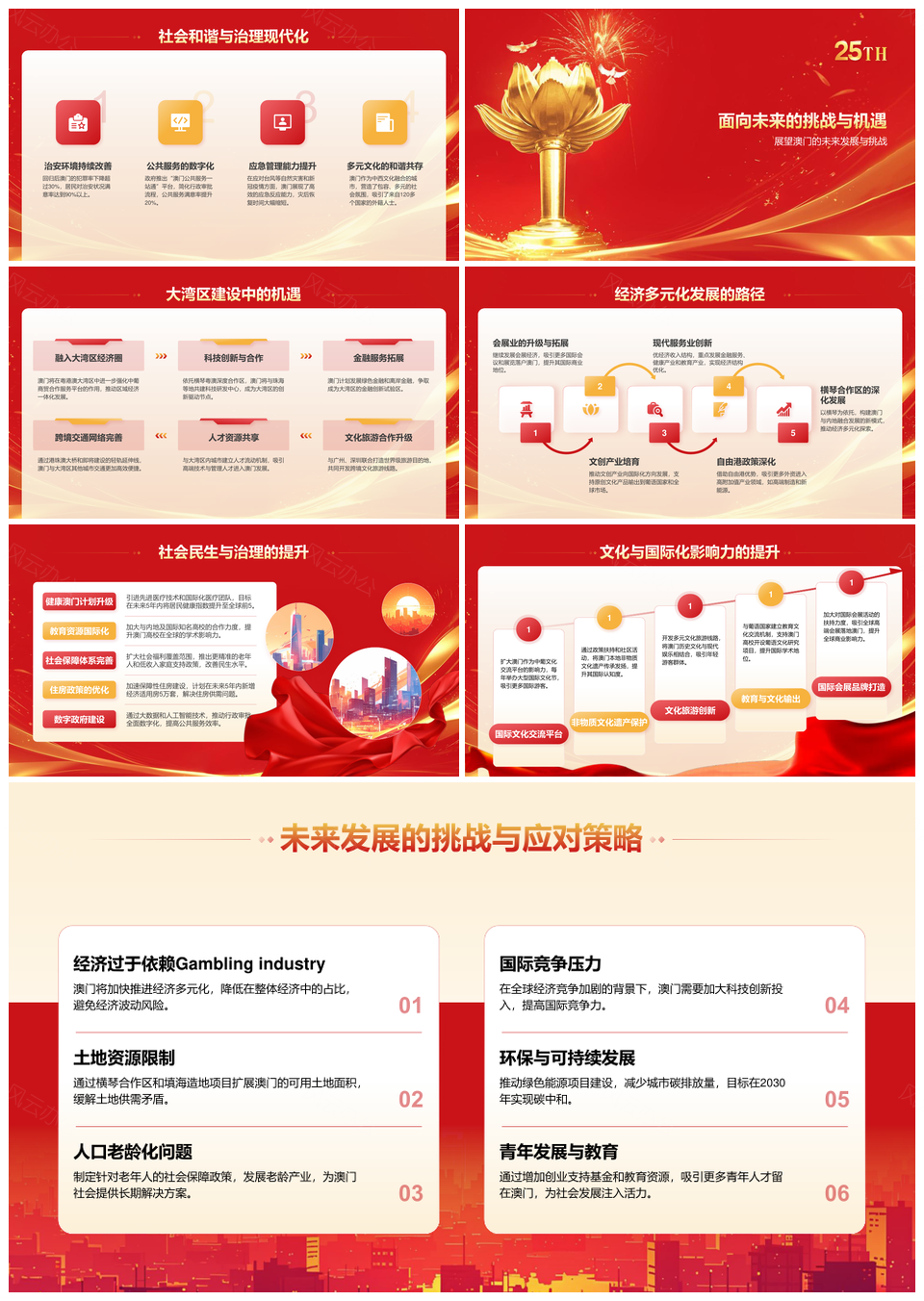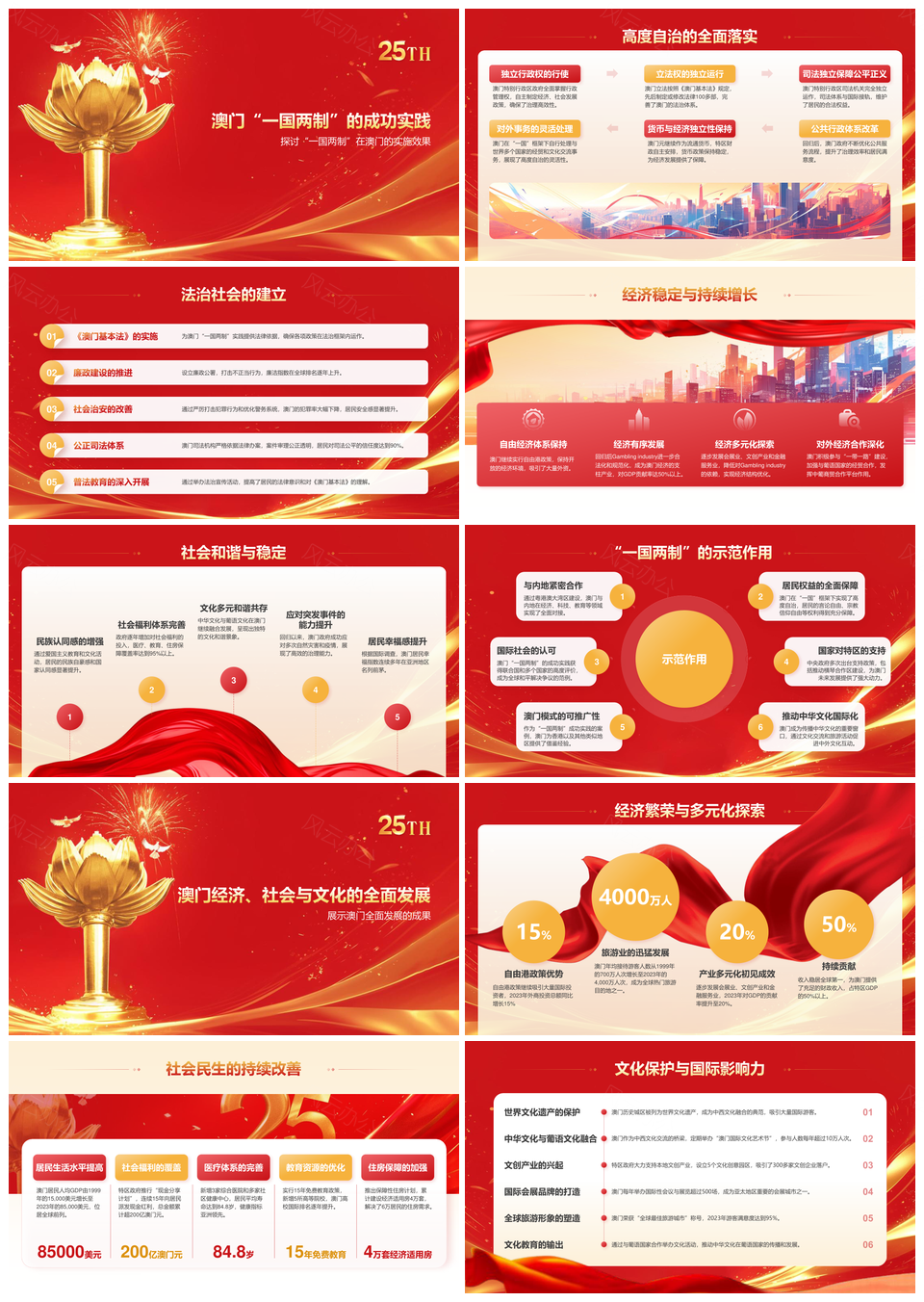 这是一张2025澳门回归25载一国两制繁荣发展实践展望PPT模板,包含2025、澳门回归、25载、一国两制、繁荣发展、实践、展望等主题内容,也可用作2025澳门回归25载一国两制、澳门回归25载一国两制繁荣、回归25载一国两制繁荣发展、25载一国两制繁荣发展实践、一国两制繁荣发展实践展望、澳门回归一国两制繁荣发展、2025澳门回归一国两制、25载繁荣发展实践展望、繁荣发展实践展望澳门、2025澳门一国两制繁荣、澳门回归繁荣发展实践、回归一国两制发展实践、一国两制发展实践展望、繁荣发展实践澳门回归、2025澳门繁荣发展实践等PPT场景使用。 风云办公提供的2025澳门回归25载一国两制繁荣发展实践展望PPT模板,下载格式为pptx,一共25页,作品中文字及图均可以修改和编辑,图片更改请在作品中右键图片并更换,文字修改请直接点击文字进行修改。