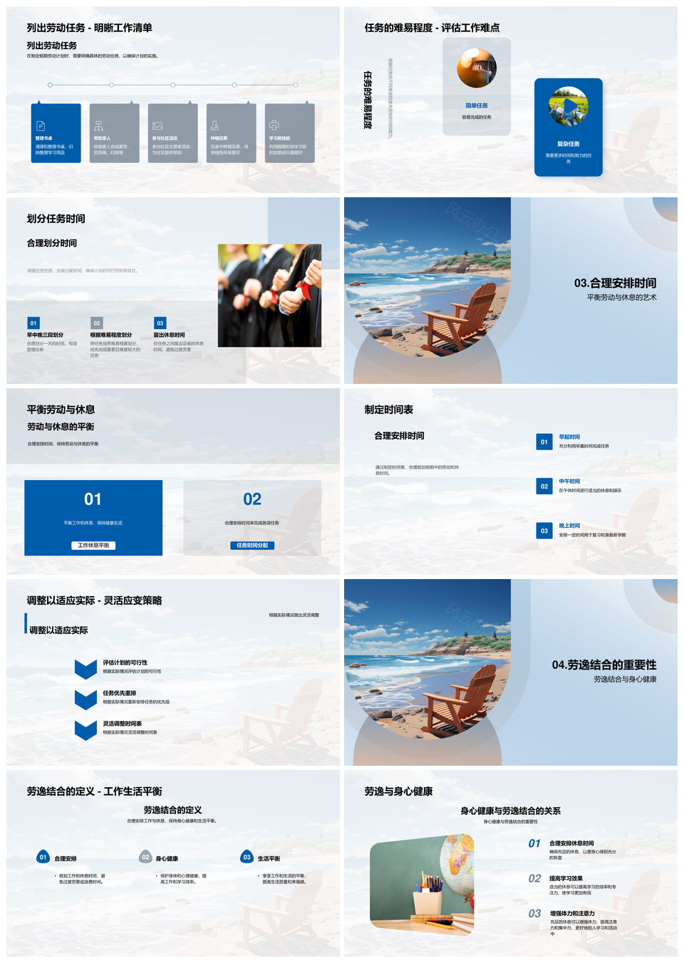 这是一张假期劳逸结合劳动计划时间表促身心健康PPT模板,包含假期、劳逸结合、劳动计划、时间表、促、身心健康等主题内容,也可用作假期劳逸结合劳动计划时间表、劳逸结合劳动计划时间表促、假期劳逸结合劳动计划、劳逸结合计划时间表促、劳动计划时间表促身心健康、假期劳逸结合计划、劳逸结合劳动计划、假期劳动计划时间表、劳逸结合时间表促、劳动计划促身心健康、计划时间表促、时间表促身心健康、劳逸结合劳动、假期劳逸结合、计划时间表等PPT场景使用。 风云办公提供的假期劳逸结合劳动计划时间表促身心健康PPT模板,下载格式为pptx,一共23页,作品中文字及图均可以修改和编辑,图片更改请在作品中右键图片并更换,文字修改请直接点击文字进行修改。