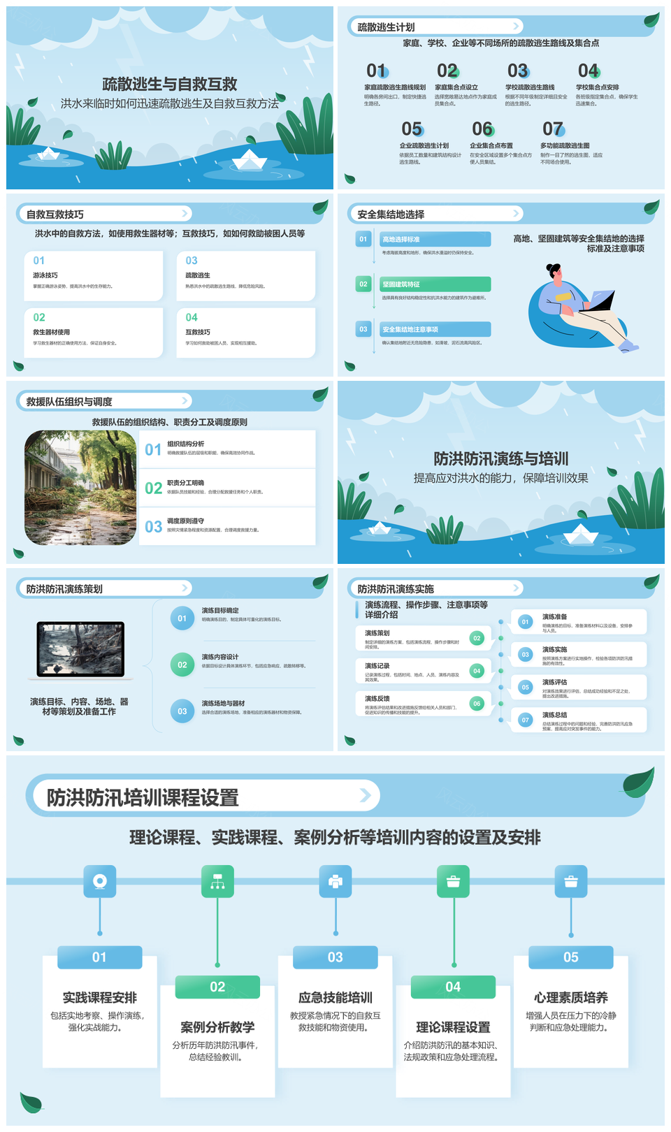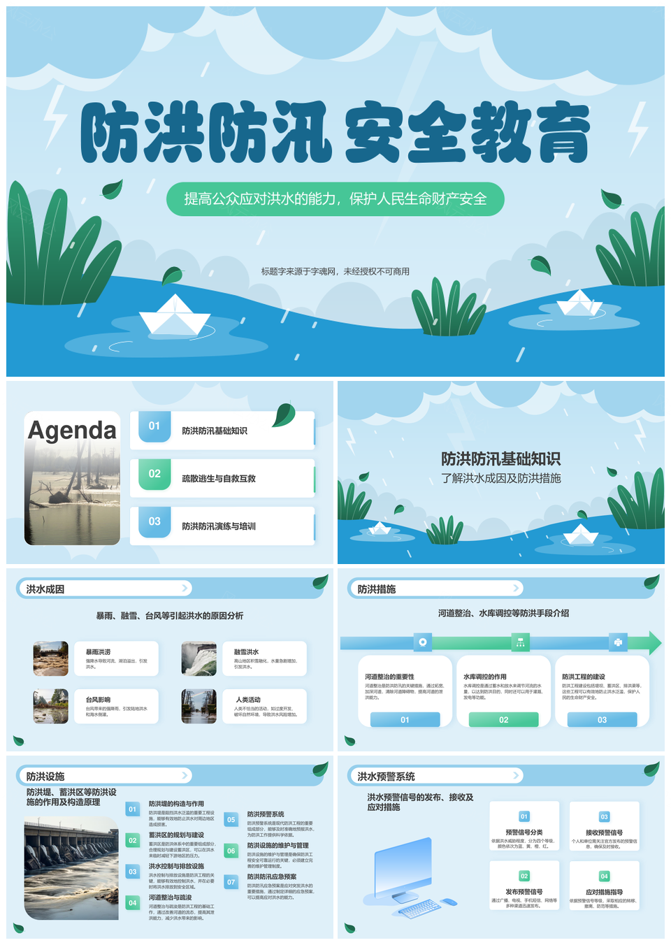 这是一张防洪防汛安全教育应急预警疏散监测公众参与PPT模板,包含防洪、防汛、安全教育、应急、预警、疏散、监测、公众参与等主题内容,也可用作防洪防汛安全教育应急预警、防洪防汛应急预警疏散监测、安全教育应急预警疏散监测、应急预警疏散监测公众参与、防洪防汛安全教育、防汛安全教育应急预警、安全教育应急预警、应急预警疏散监测、防洪防汛应急预警、防汛应急预警疏散、应急预警疏散公众、预警疏散监测公众、防洪防汛疏散监测、疏散监测公众参与、防汛安全教育应急等PPT场景使用。 风云办公提供的防洪防汛安全教育应急预警疏散监测公众参与PPT模板,下载格式为pptx,一共17页,作品中文字及图均可以修改和编辑,图片更改请在作品中右键图片并更换,文字修改请直接点击文字进行修改。