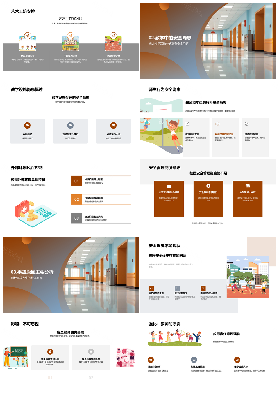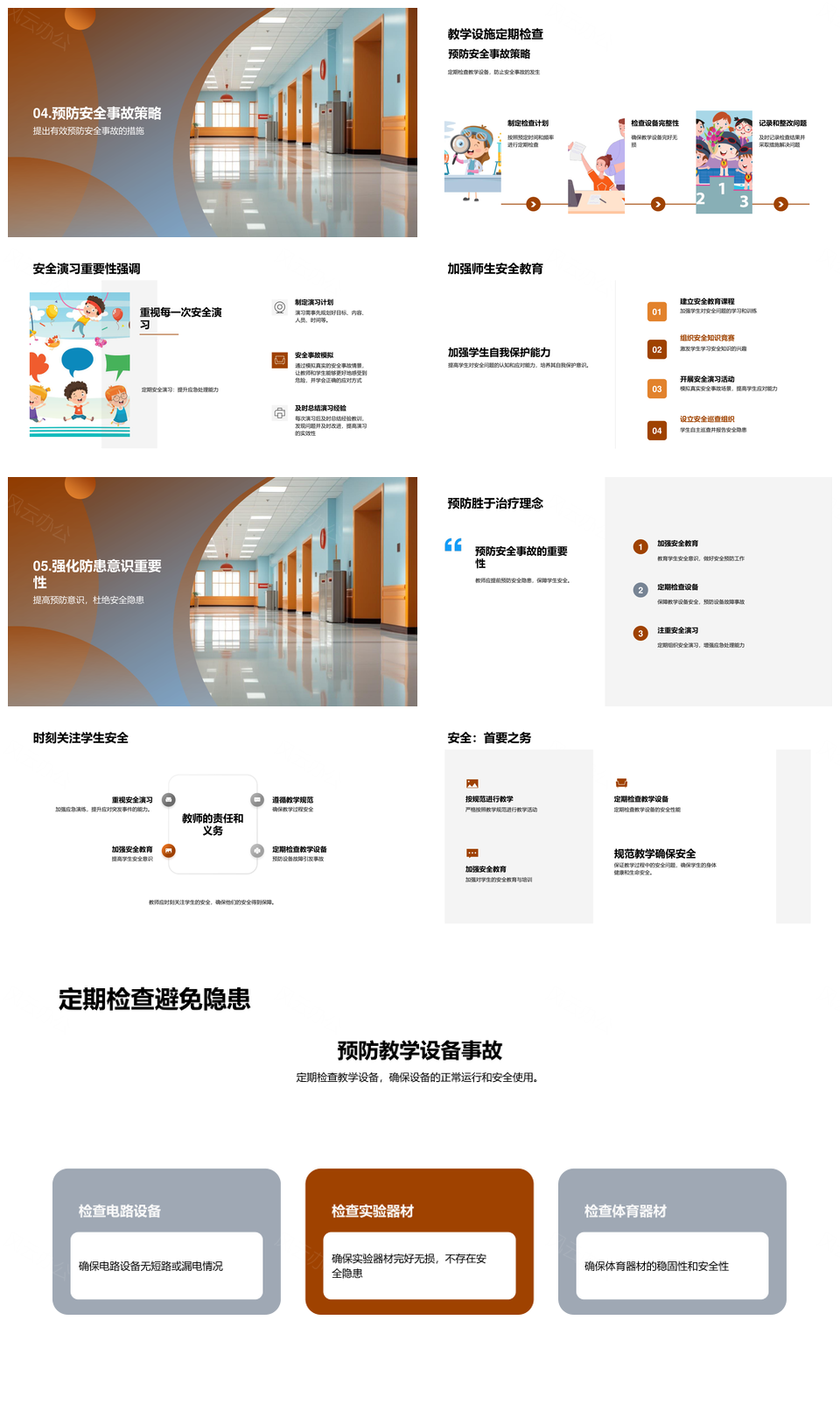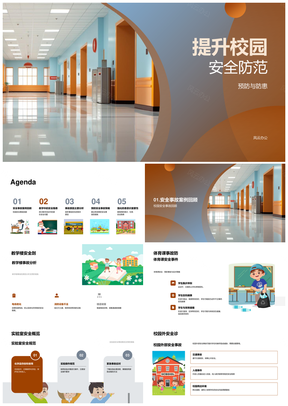 这是一张校园安全防范教学设施隐患预防教育管理PPT模板,包含校园、安全、防范、教学、设施、隐患、预防、教育、管理等主题内容,也可用作校园安全防范教学设施、安全防范教学设施隐患、防范教学设施隐患预防、教学设施隐患预防教育、设施隐患预防教育管理、校园安全防范教学、安全防范教学设施、防范教学设施隐患、教学设施隐患预防、隐患预防教育管理、安全防范教育管理、校园安全隐患预防、教学设施隐患预防、隐患预防教育、教育管理等PPT场景使用。 风云办公提供的校园安全防范教学设施隐患预防教育管理PPT模板,下载格式为pptx,一共27页,作品中文字及图均可以修改和编辑,图片更改请在作品中右键图片并更换,文字修改请直接点击文字进行修改。