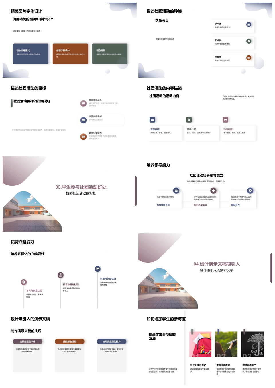 风云办公提供的专科校园社团教育活动拓展自我PPT模板,下载格式为pptx,一共21页,作品中文字及图均可以修改和编辑,图片更改请在作品中右键图片并更换,文字修改请直接点击文字进行修改。