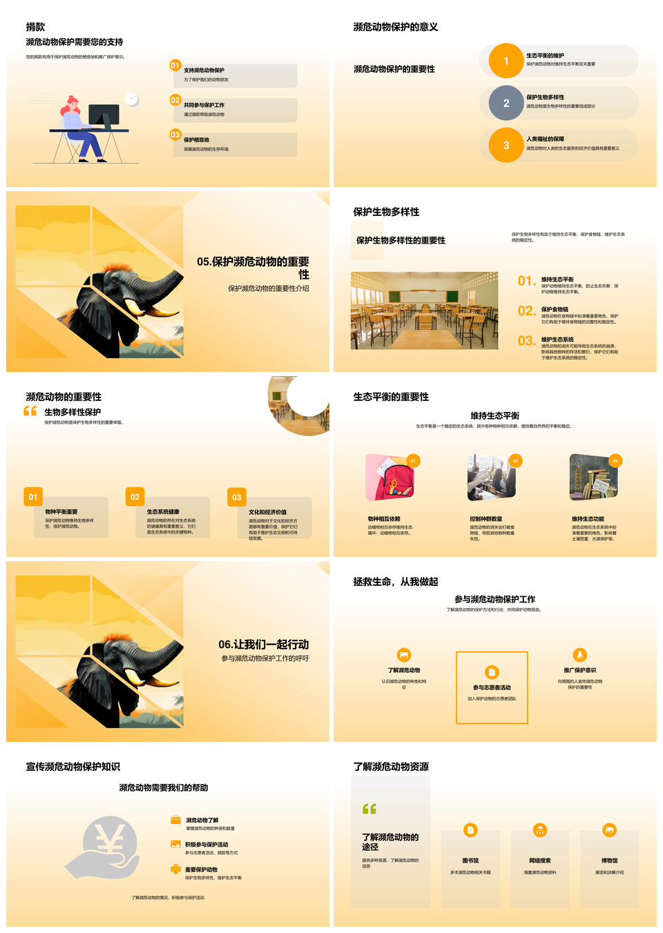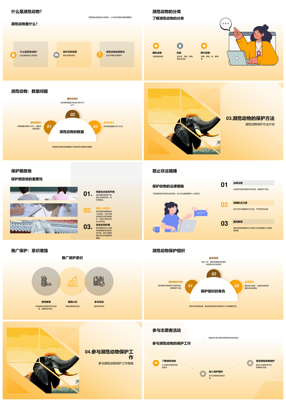 这是一张濒危动物保护环保志愿宣传小学生自然科学栖息地灭绝PPT模板,包含濒危动物、保护、环保、志愿、宣传、小学生、自然科学、栖息地、灭绝等主题内容,也可用作濒危动物保护环保志愿、保护环保志愿宣传、环保志愿宣传小学生、濒危动物环保志愿宣传、保护环保宣传小学生、濒危动物保护宣传小学生、濒危动物保护环保、环保志愿宣传、志愿宣传小学生、宣传小学生自然科学、保护环保志愿、环保宣传小学生、濒危动物保护宣传、自然科学栖息地灭绝、栖息地灭绝等PPT场景使用。 风云办公提供的濒危动物保护环保志愿宣传小学生自然科学栖息地灭绝PPT模板,下载格式为pptx,一共28页,作品中文字及图均可以修改和编辑,图片更改请在作品中右键图片并更换,文字修改请直接点击文字进行修改。
