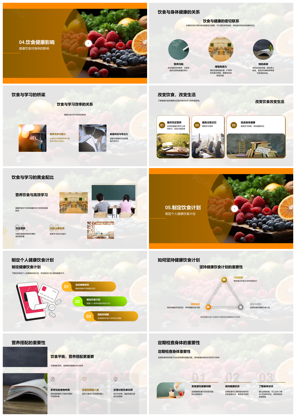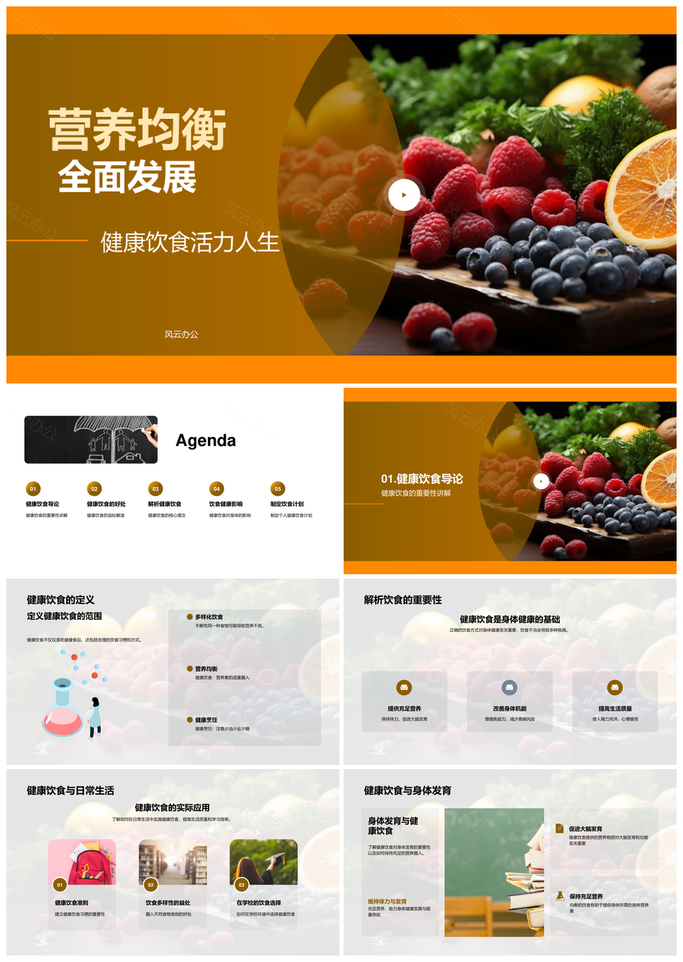 风云办公提供的营养均衡健康饮食促全面发展提效率PPT模板,下载格式为pptx,一共28页,作品中文字及图均可以修改和编辑,图片更改请在作品中右键图片并更换,文字修改请直接点击文字进行修改。