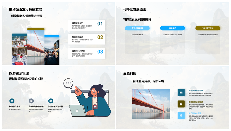 这是一张旅游资源保护可持续发展管理路径PPT模板,包含旅游资源、保护、可持续、发展、管理、路径等主题内容,也可用作旅游资源保护可持续、资源保护可持续发展、保护可持续发展管理、可持续发展管理路径、旅游资源保护、资源保护可持续、保护可持续发展、可持续发展管理、发展管理路径、旅游资源、资源保护、保护可持续、可持续发展、发展管理、管理路径等PPT场景使用。