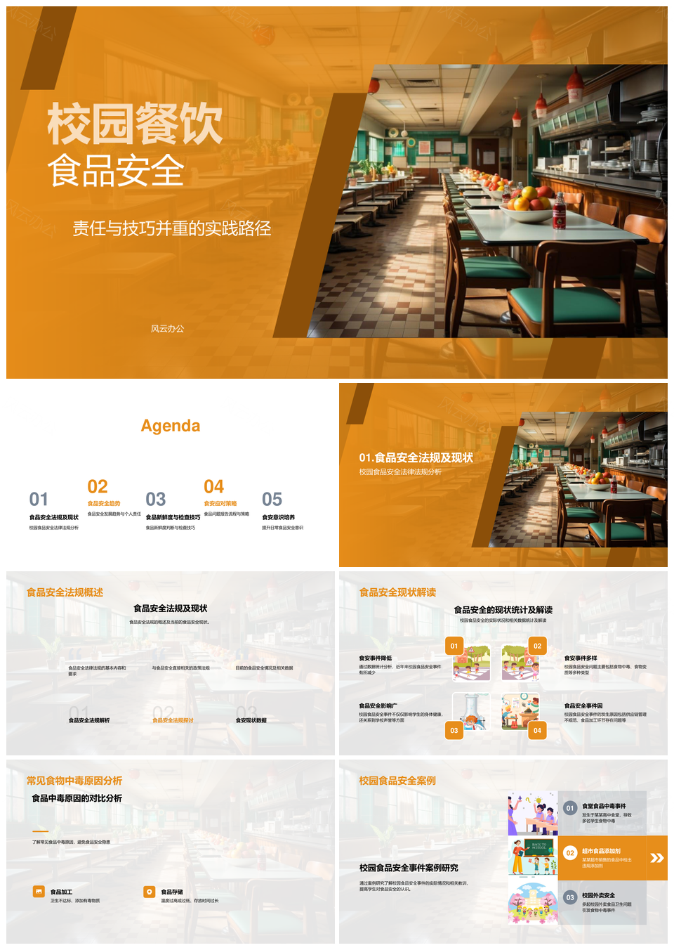 风云办公提供的校园餐饮安全法规与食物中毒防范责任PPT模板,下载格式为pptx,一共25页,作品中文字及图均可以修改和编辑,图片更改请在作品中右键图片并更换,文字修改请直接点击文字进行修改。