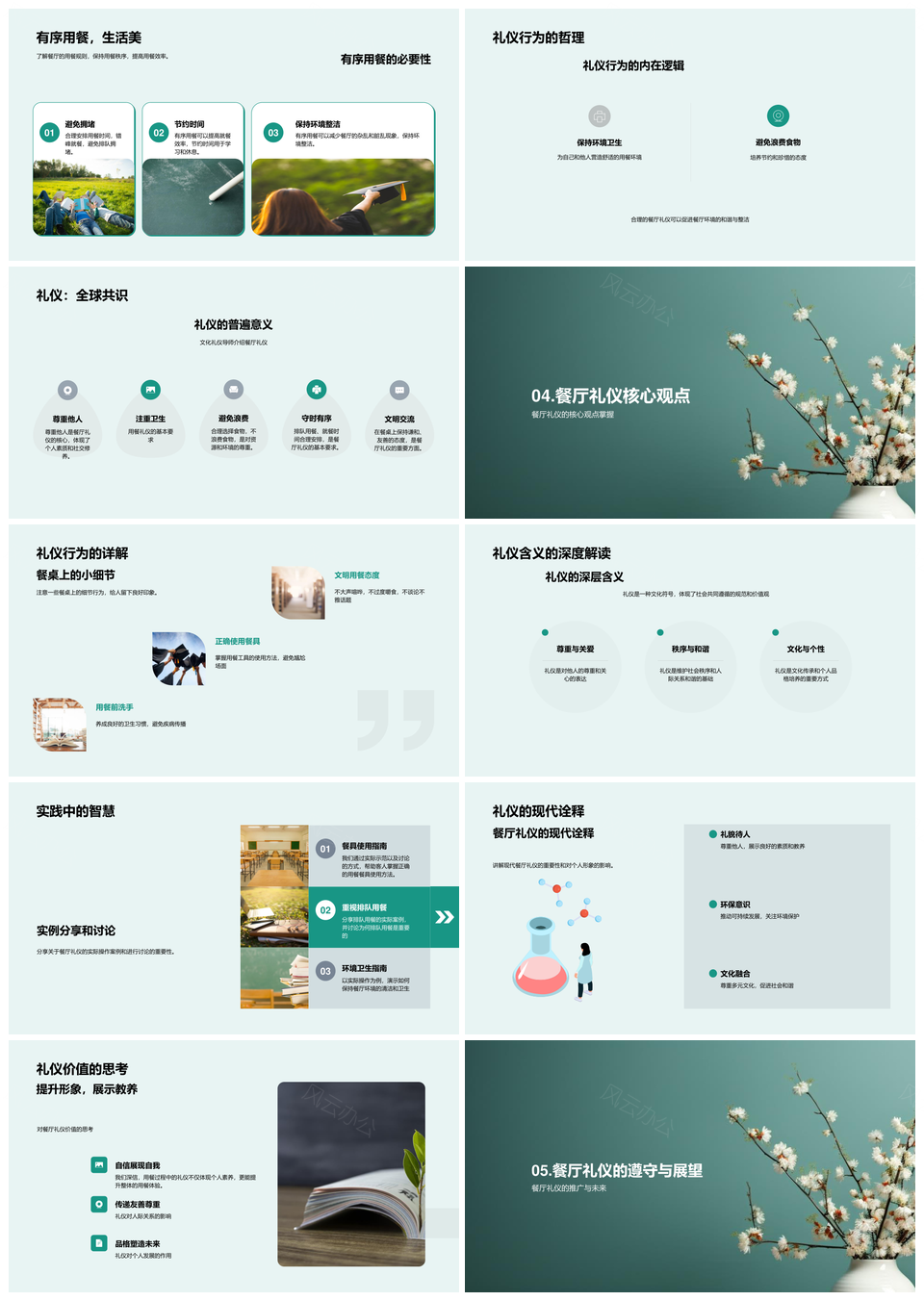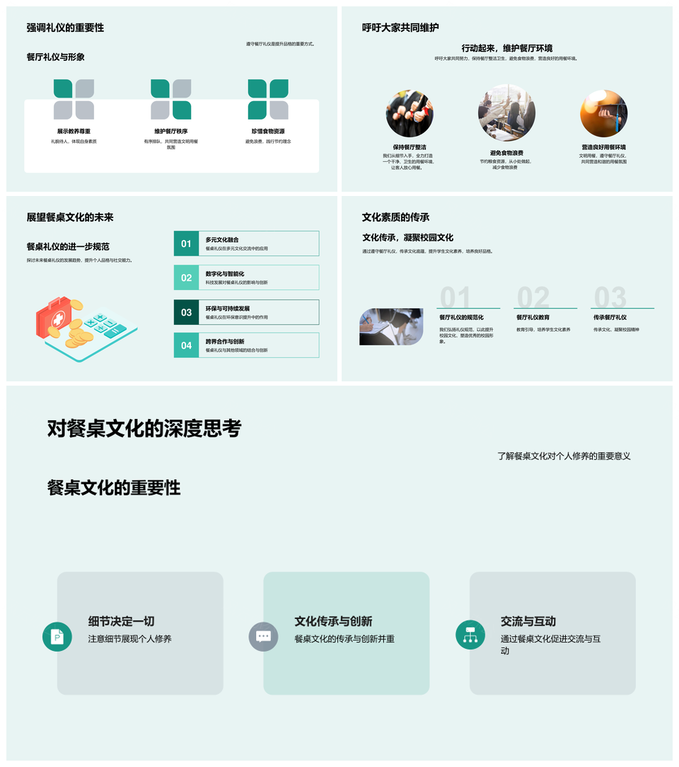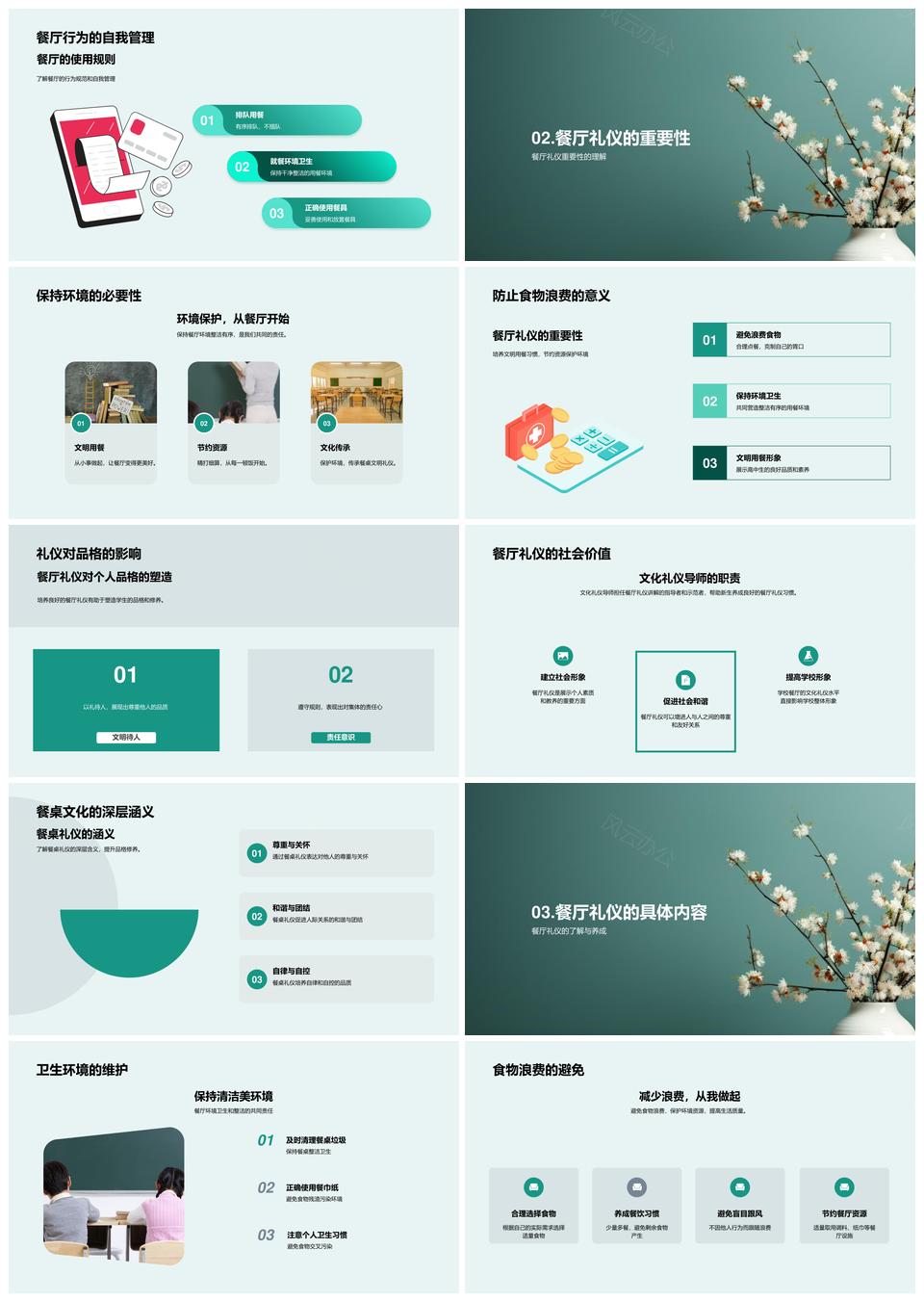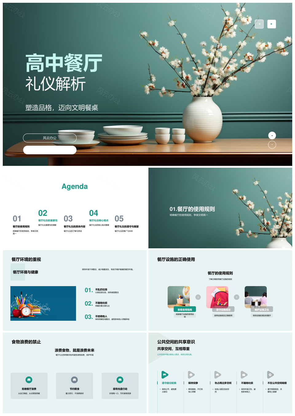 这是一张高中餐厅文明用餐礼仪节约有序护环境养品格PPT模板,包含高中餐厅、文明用餐、礼仪、节约、有序、护环境、养品格等主题内容,也可用作高中餐厅文明用餐、高中餐厅文明用餐礼仪、餐厅文明用餐礼仪节约、文明用餐礼仪节约有序、用餐礼仪节约有序护环境、礼仪节约有序护环境养品格、高中餐厅文明、餐厅文明用餐、文明用餐礼仪、用餐礼仪节约、礼仪节约有序、节约有序护环境、有序护环境养品格、高中餐厅、护环境养品格等PPT场景使用。 风云办公提供的高中餐厅文明用餐礼仪节约有序护环境养品格PPT模板,下载格式为pptx,一共33页,作品中文字及图均可以修改和编辑,图片更改请在作品中右键图片并更换,文字修改请直接点击文字进行修改。