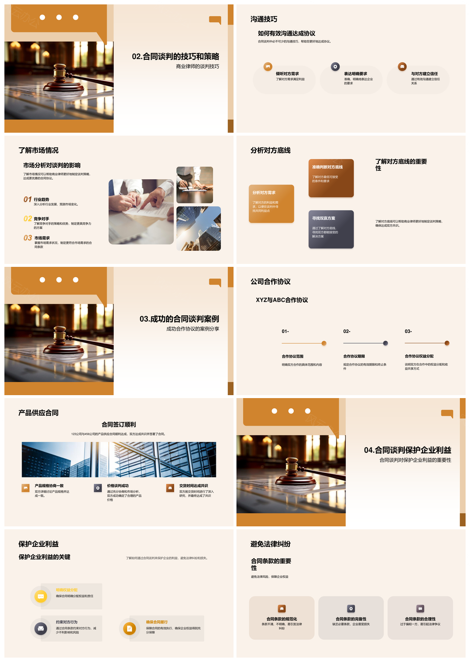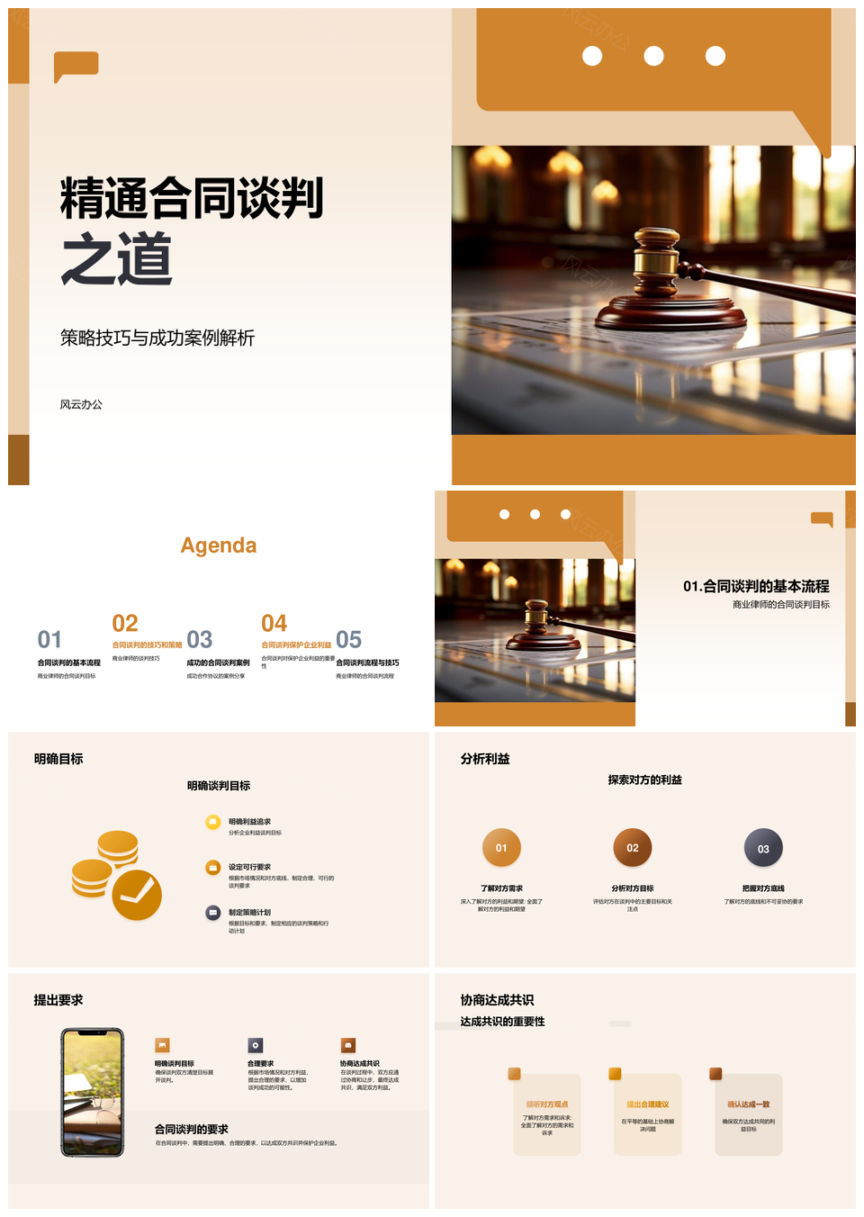 这是一张商业律师合同谈判目标利益共识技巧策略PPT模板,包含商业、律师、合同、谈判、目标、利益、共识、技巧、策略等主题内容,也可用作商业律师合同谈判、律师合同谈判目标、合同谈判目标利益、谈判目标利益共识、目标利益共识技巧、利益共识技巧策略、商业律师合同谈判目标、律师合同谈判目标利益、合同谈判目标利益共识、谈判目标利益共识技巧、目标利益共识技巧策略、合同谈判技巧策略、律师谈判利益技巧、商业合同利益策略、目标利益技巧策略等PPT场景使用。 风云办公提供的商业律师合同谈判目标利益共识技巧策略PPT模板,下载格式为pptx,一共23页,作品中文字及图均可以修改和编辑,图片更改请在作品中右键图片并更换,文字修改请直接点击文字进行修改。