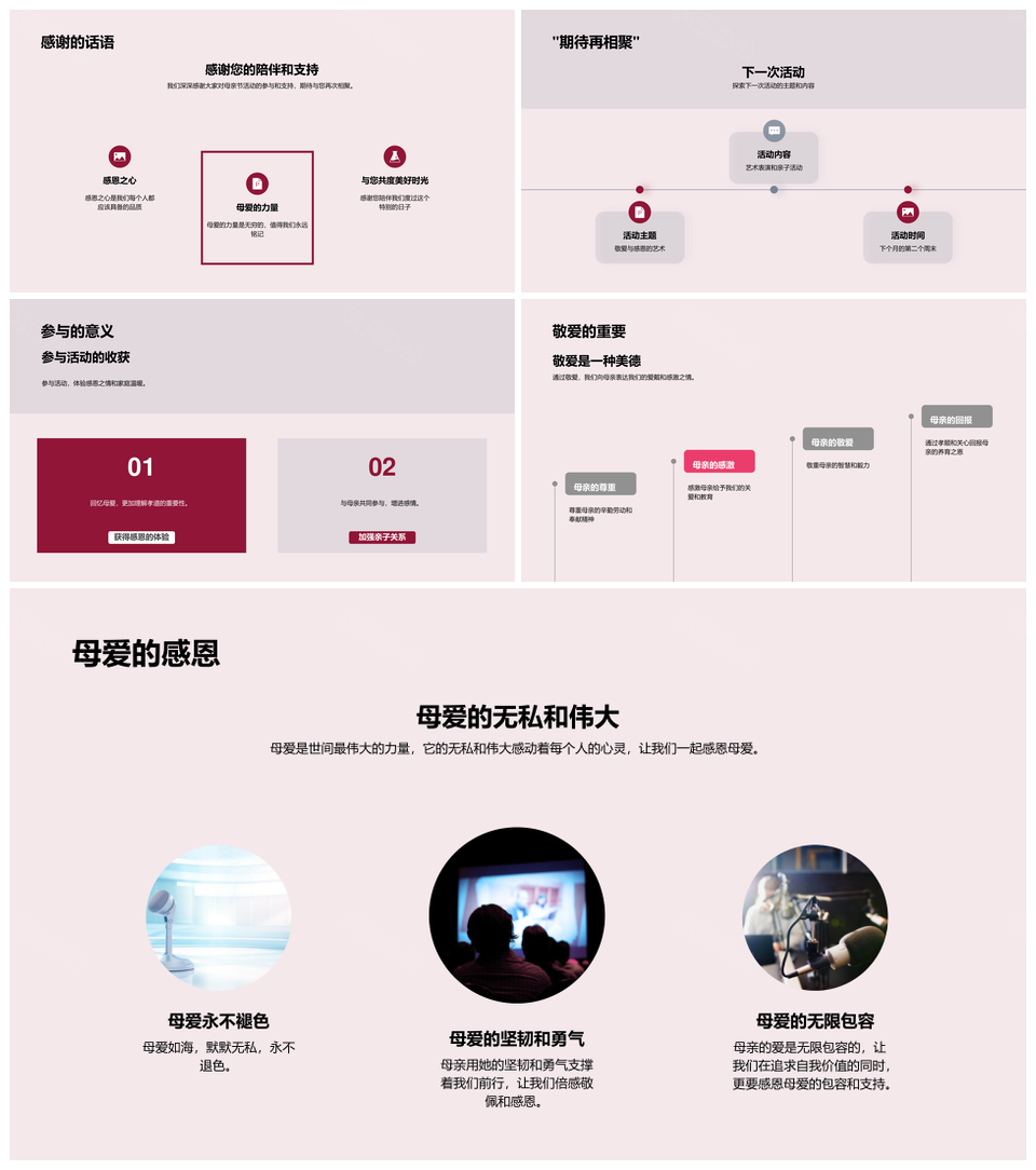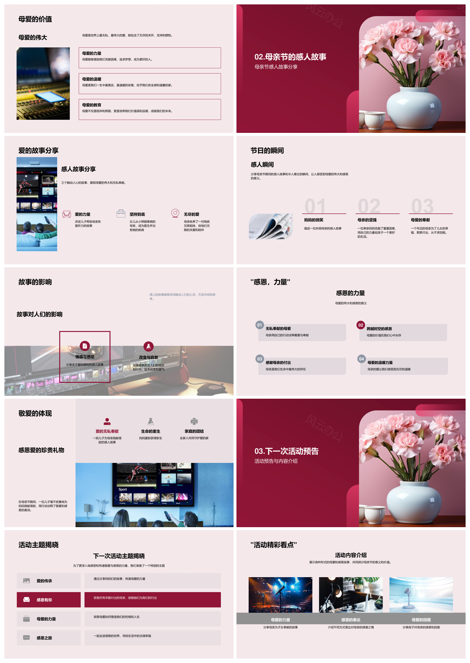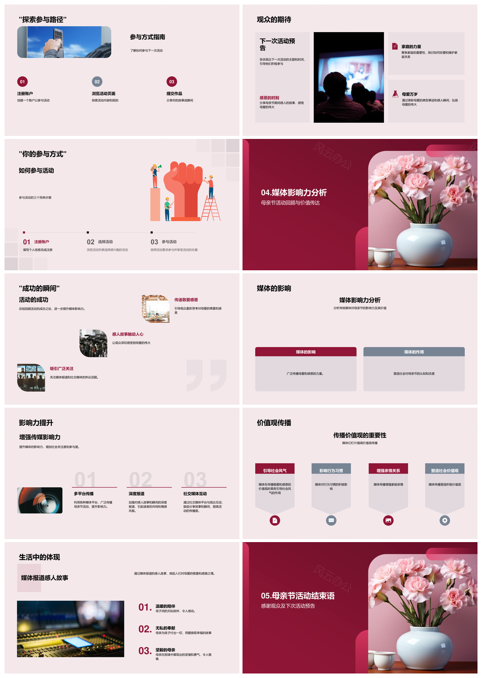 这是一张母亲节康乃馨母爱敬感媒体影响感恩故事PPT模板,包含母亲节、康乃馨、母爱、敬感、媒体、影响、感恩、故事等主题内容,也可用作母亲节康乃馨母爱感恩、母亲节康乃馨媒体影响、康乃馨母爱感恩故事、母爱感恩故事媒体、母亲节媒体影响故事、康乃馨母爱母亲节、感恩母爱母亲节康乃馨、母亲节康乃馨母爱、康乃馨母爱感恩、母爱感恩故事、媒体影响故事、母亲节媒体影响、康乃馨感恩故事、感恩母爱故事、母亲节母爱感恩等PPT场景使用。 风云办公提供的母亲节康乃馨母爱敬感媒体影响感恩故事PPT模板,下载格式为pptx,一共33页,作品中文字及图均可以修改和编辑,图片更改请在作品中右键图片并更换,文字修改请直接点击文字进行修改。