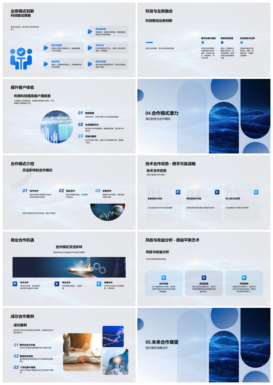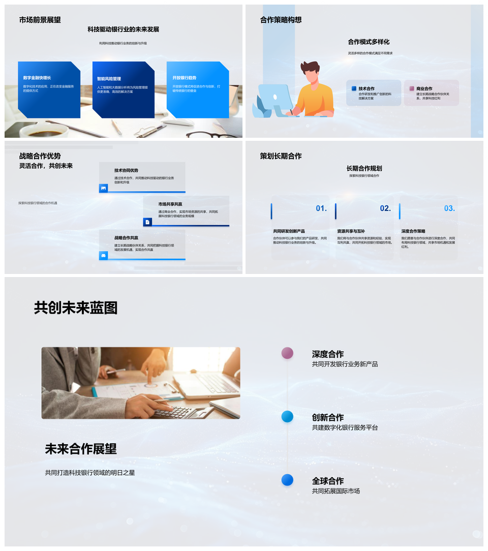 风云办公提供的银行科技创新合作发展策略研讨路演PPT模板,下载格式为pptx,一共33页,作品中文字及图均可以修改和编辑,图片更改请在作品中右键图片并更换,文字修改请直接点击文字进行修改。