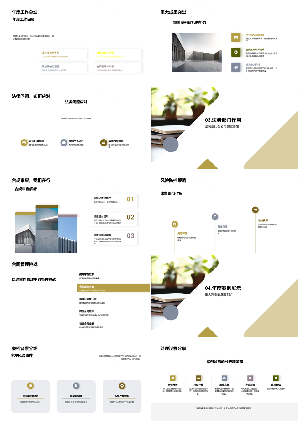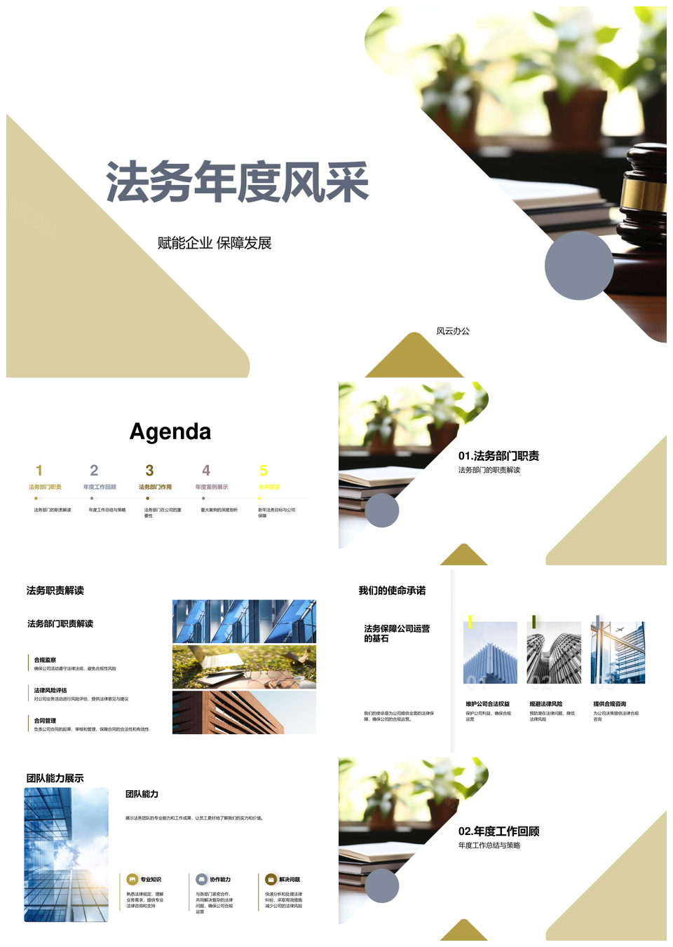 风云办公提供的法务年度风采赋能护企践责显效PPT模板,下载格式为pptx,一共23页,作品中文字及图均可以修改和编辑,图片更改请在作品中右键图片并更换,文字修改请直接点击文字进行修改。