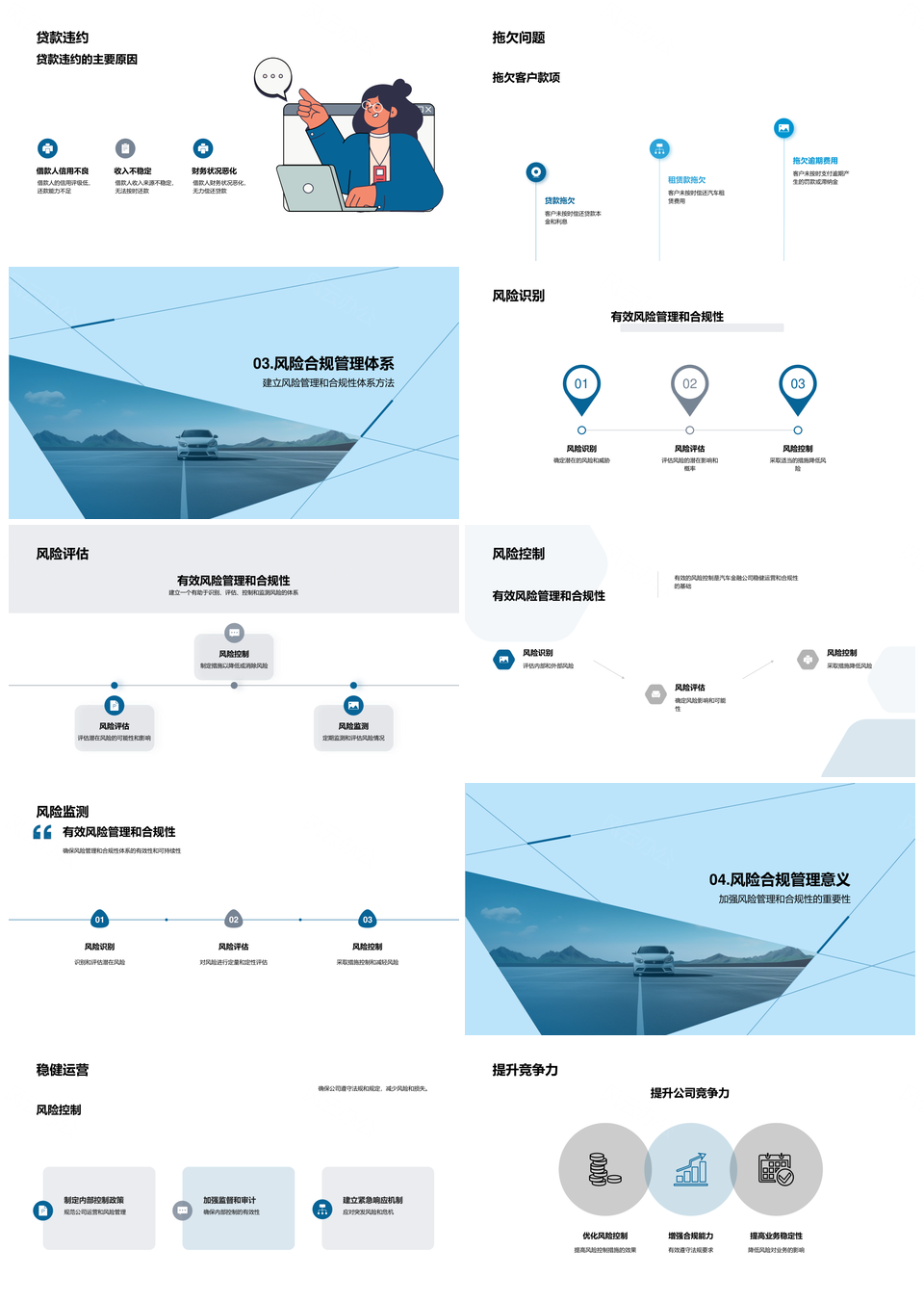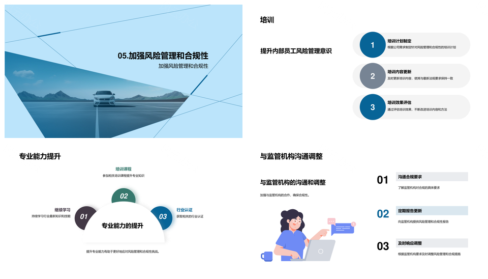 这是一张汽车金融风控合规与信用市场风险管理年会演讲PPT模板,包含汽车、金融、风控、合规、信用、市场、风险、管理、年会、演讲等主题内容,也可用作汽车金融风控合规、信用市场风险管理年会、市场风险管理年会演讲、汽车金融风控、金融风控合规、信用市场风险管理、风险管理年会演讲、汽车金融合规、汽车金融、金融风控、风控合规、信用市场、市场风险管理、风险管理年会、年会演讲等PPT场景使用。 风云办公提供的汽车金融风控合规与信用市场风险管理年会演讲PPT模板,下载格式为pptx,一共22页,作品中文字及图均可以修改和编辑,图片更改请在作品中右键图片并更换,文字修改请直接点击文字进行修改。