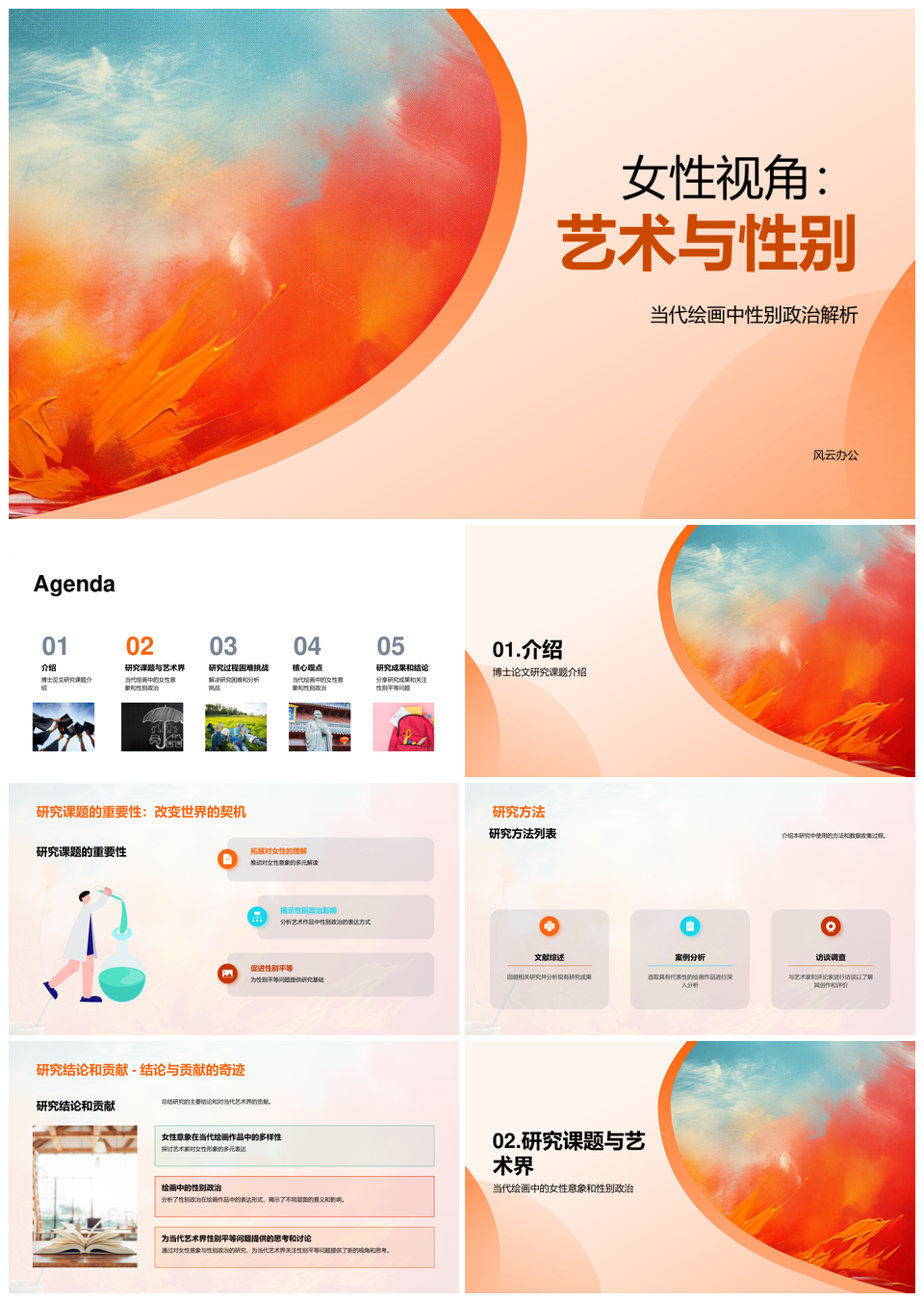 风云办公提供的女性视角艺术性别政治画笔研究分析PPT模板,下载格式为pptx,一共21页,作品中文字及图均可以修改和编辑,图片更改请在作品中右键图片并更换,文字修改请直接点击文字进行修改。