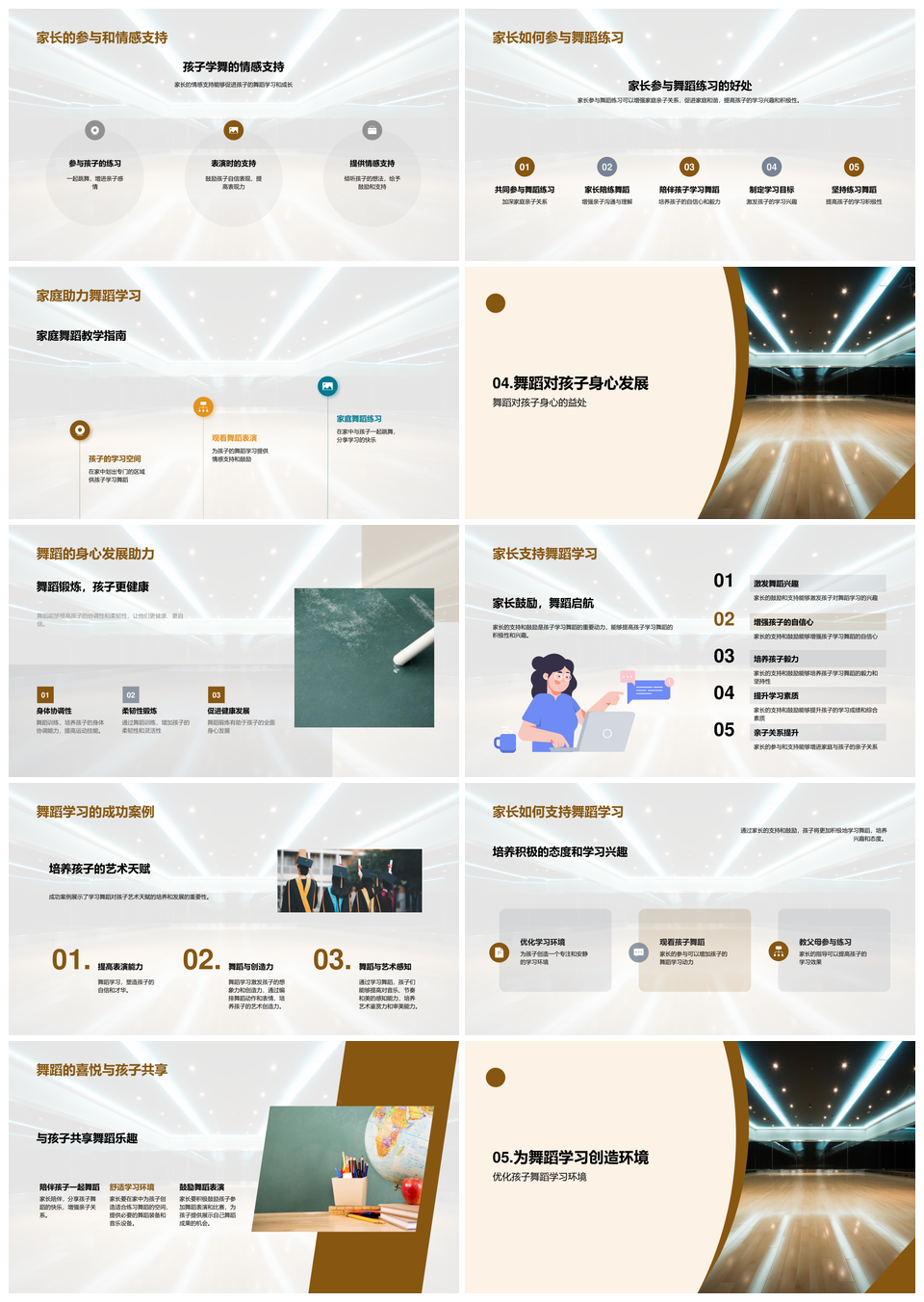 这是一张少儿舞蹈学习助力身心艺体发展家长共育PPT模板,包含少儿、舞蹈、学习、助力、身心、艺体、发展、家长、共育等主题内容,也可用作少儿舞蹈学习助力、舞蹈学习助力身心、学习助力身心艺体、助力身心艺体发展、身心艺体发展家长、艺体发展家长共育、少儿舞蹈学习、舞蹈学习助力、学习助力身心、助力身心艺体、身心艺体发展、艺体发展家长、发展家长共育、少儿舞蹈、舞蹈学习等PPT场景使用。 风云办公提供的少儿舞蹈学习助力身心艺体发展家长共育PPT模板,下载格式为pptx,一共33页,作品中文字及图均可以修改和编辑,图片更改请在作品中右键图片并更换,文字修改请直接点击文字进行修改。