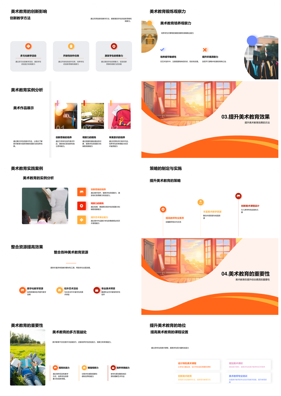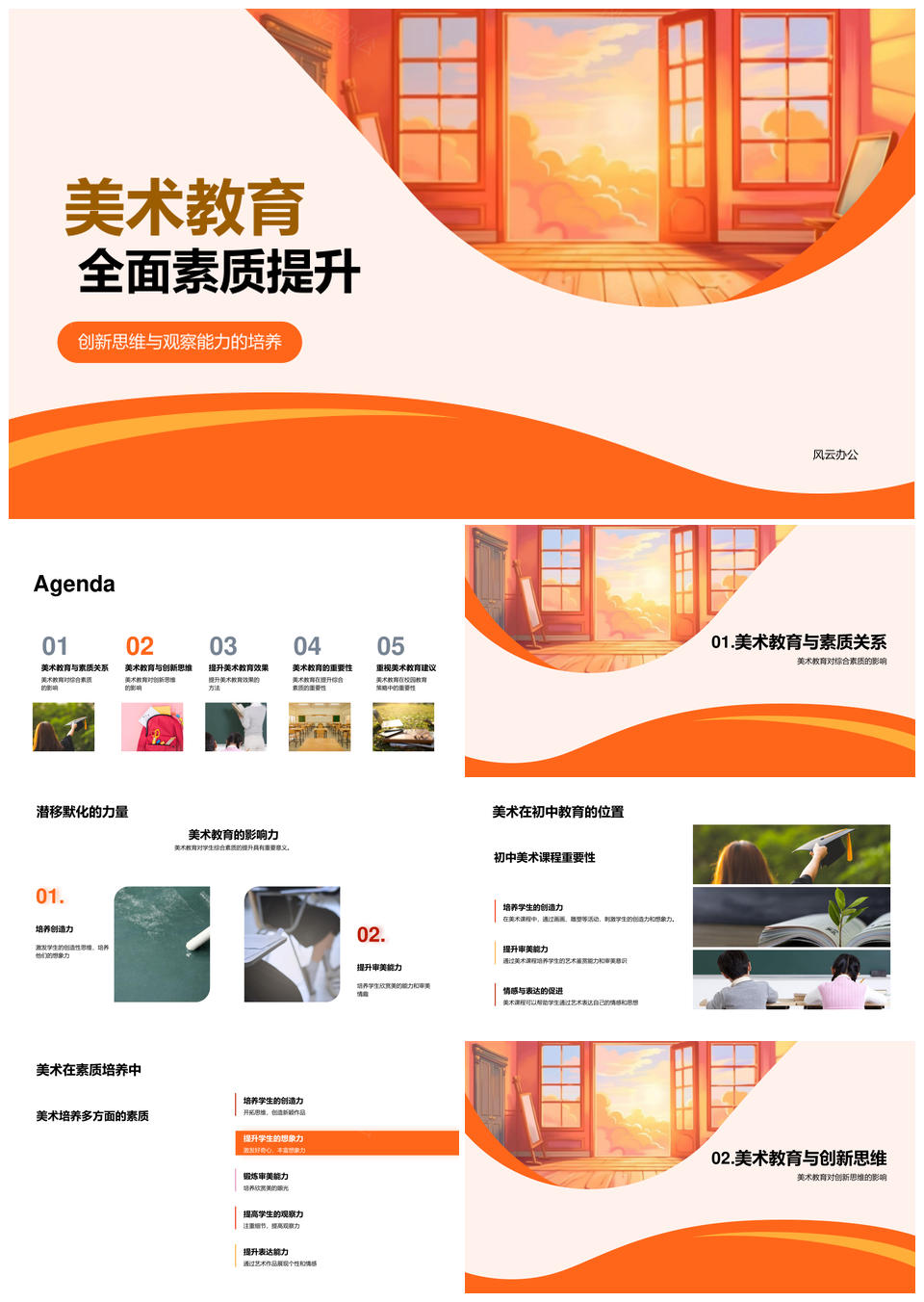风云办公提供的初中美术课程提升创新思维与综合素质PPT模板,下载格式为pptx,一共23页,作品中文字及图均可以修改和编辑,图片更改请在作品中右键图片并更换,文字修改请直接点击文字进行修改。