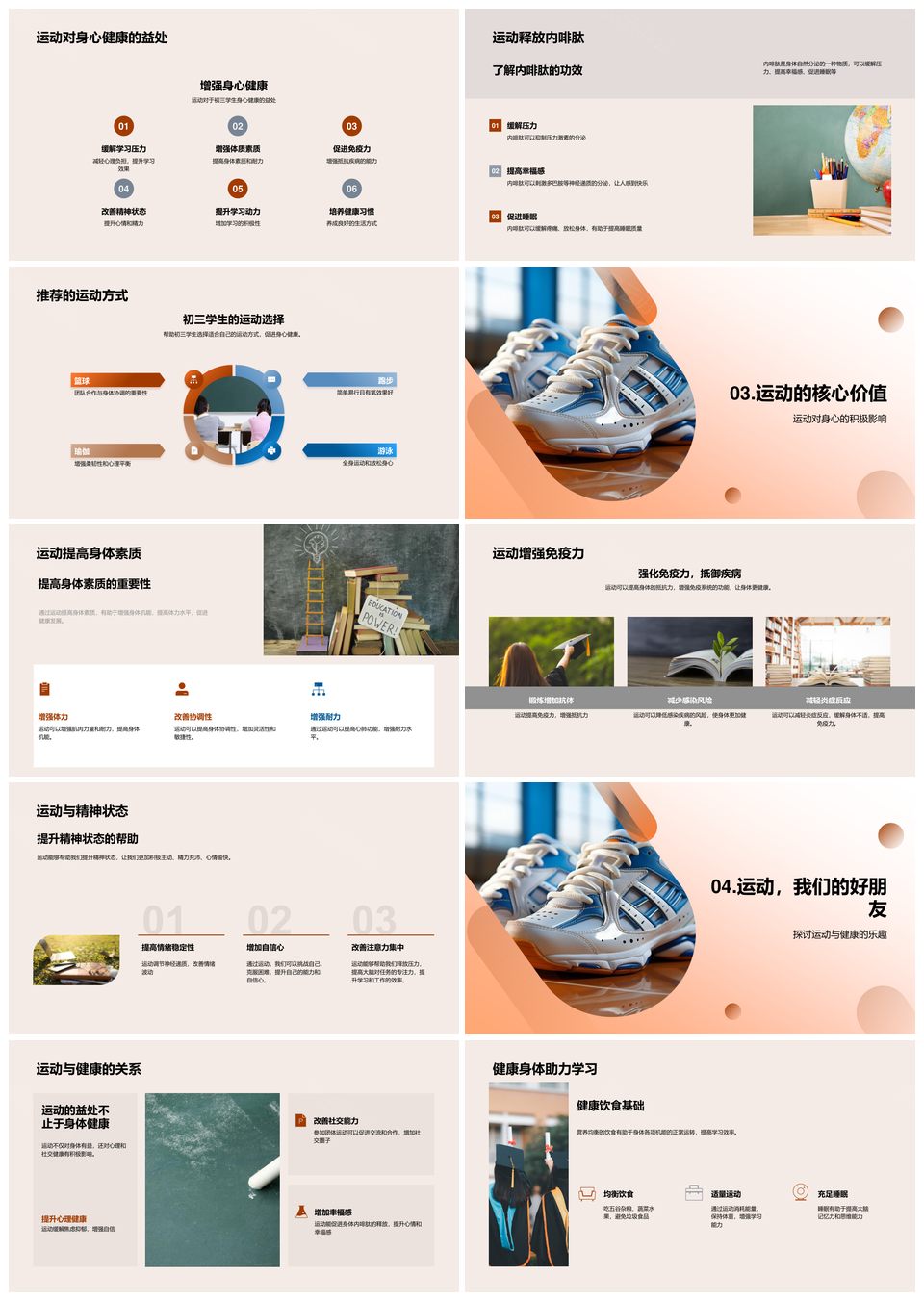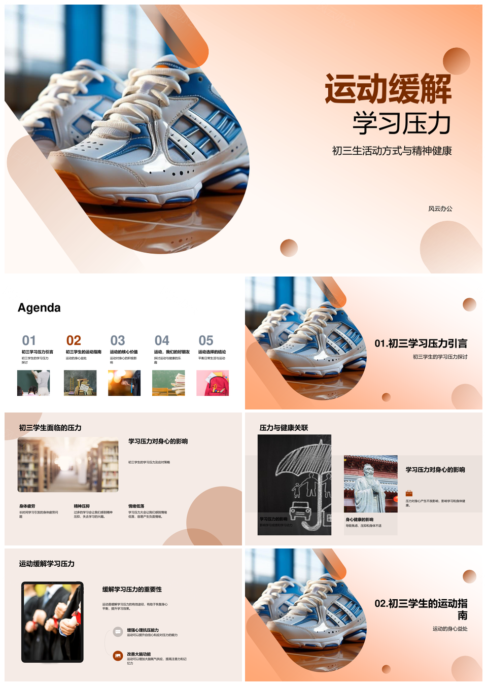 风云办公提供的初三学生运动抗压强身促身心健康PPT模板,下载格式为pptx,一共23页,作品中文字及图均可以修改和编辑,图片更改请在作品中右键图片并更换,文字修改请直接点击文字进行修改。
