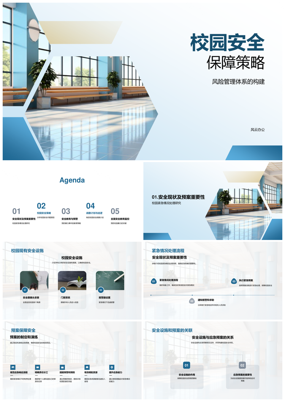 风云办公提供的校园安全风险管理教育应急设施监控PPT模板,下载格式为pptx,一共33页,作品中文字及图均可以修改和编辑,图片更改请在作品中右键图片并更换,文字修改请直接点击文字进行修改。