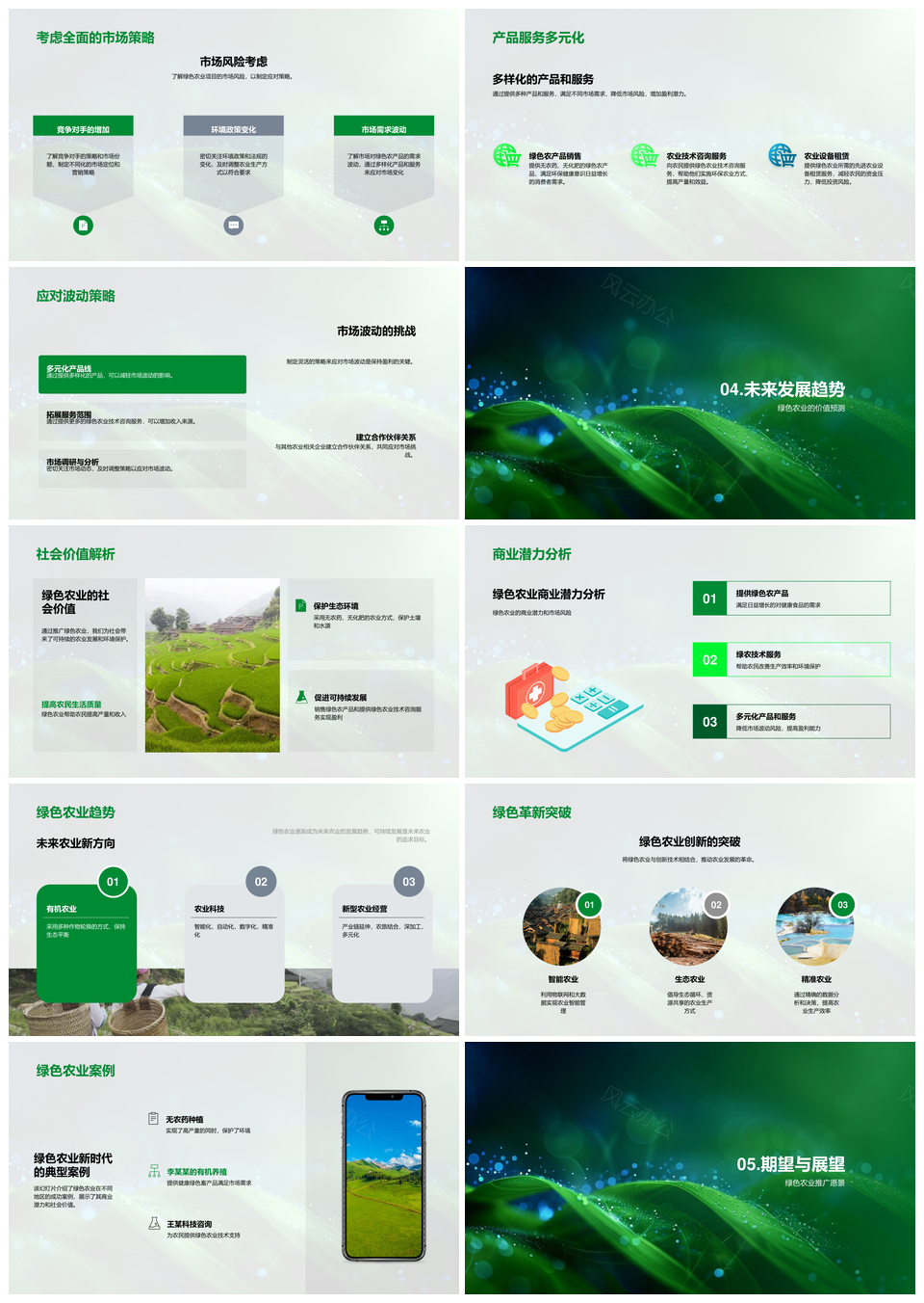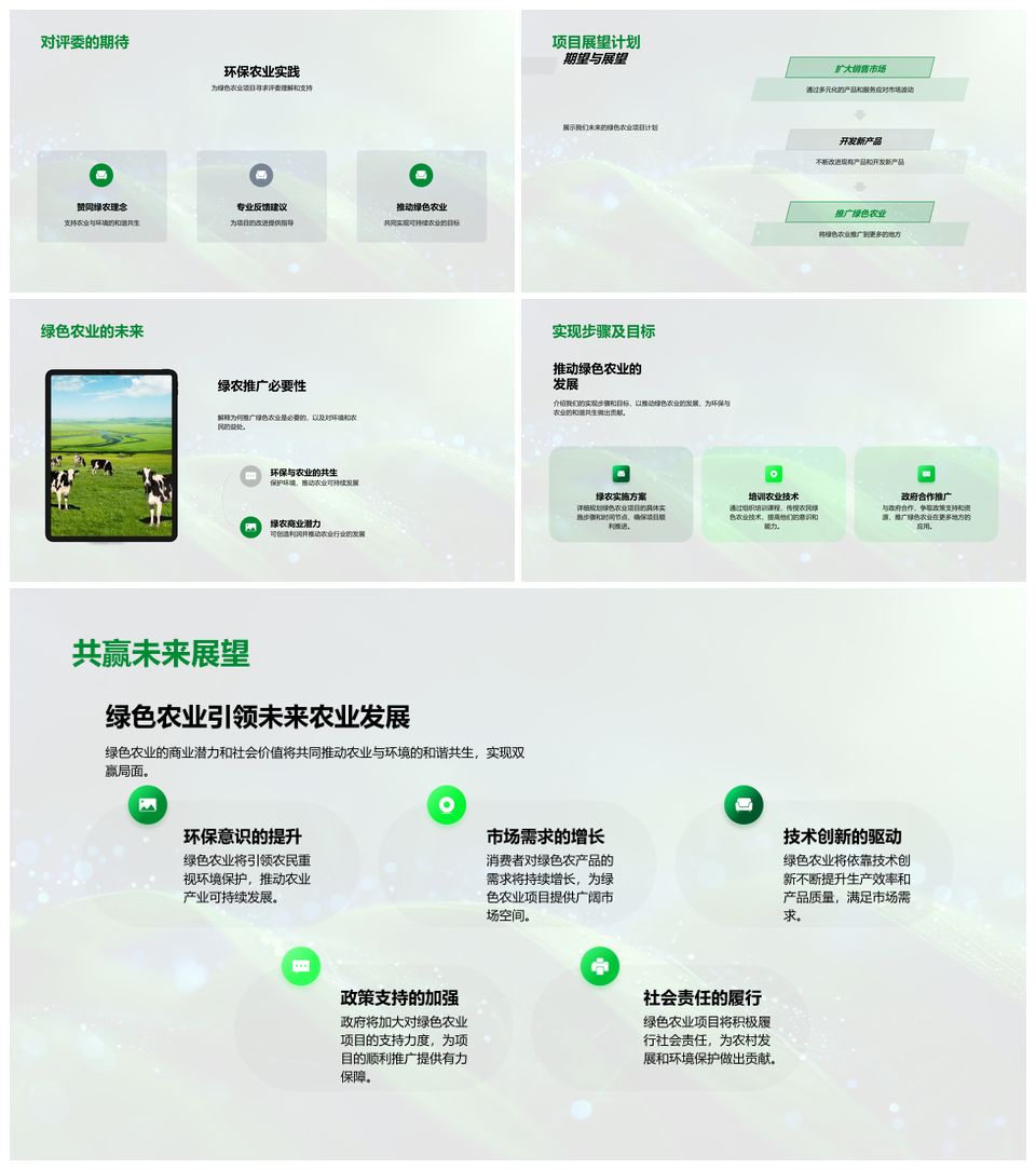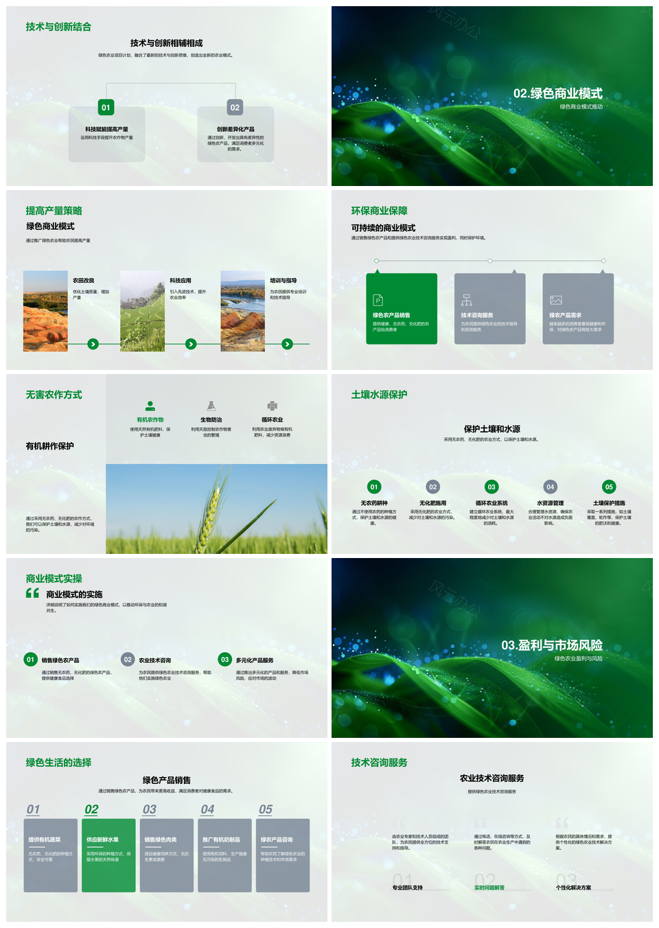 这是一张绿色农业可持续商业模式有机技术稳产环保PPT模板,包含绿色农业、可持续、商业模式、有机技术、稳产、环保等主题内容,也可用作绿色农业有机技术稳产环保、绿色农业可持续商业模式有机技术、可持续商业模式有机技术稳产、绿色农业有机技术稳产、有机技术稳产环保、绿色农业可持续商业模式、可持续商业模式稳产环保、有机技术稳产环保模式、绿色农业稳产环保技术、商业模式有机技术稳产、可持续有机技术稳产、绿色农业环保稳产技术、有机技术商业模式稳产、绿色农业可持续稳产、商业模式稳产环保技术等PPT场景使用。 风云办公提供的绿色农业可持续商业模式有机技术稳产环保PPT模板,下载格式为pptx,一共33页,作品中文字及图均可以修改和编辑,图片更改请在作品中右键图片并更换,文字修改请直接点击文字进行修改。