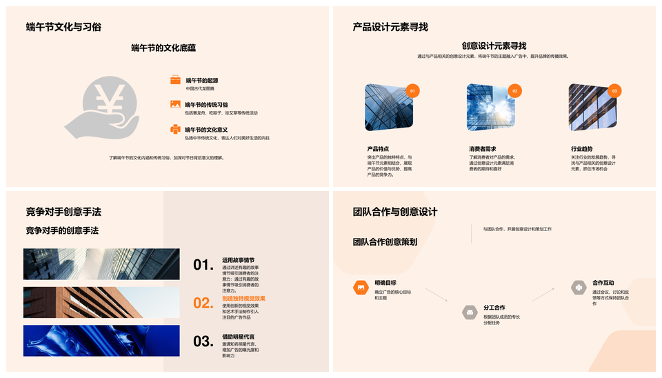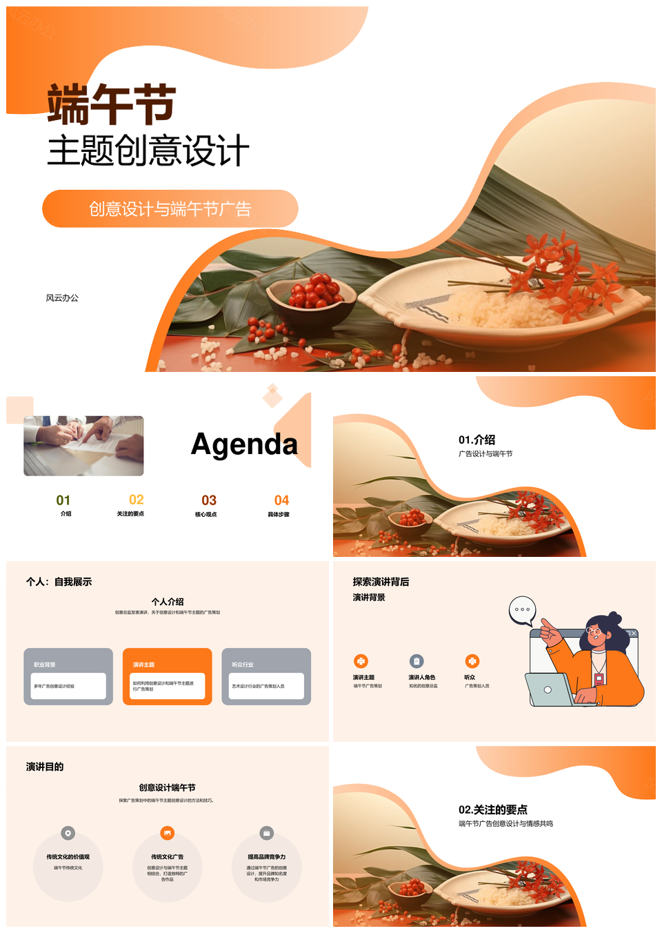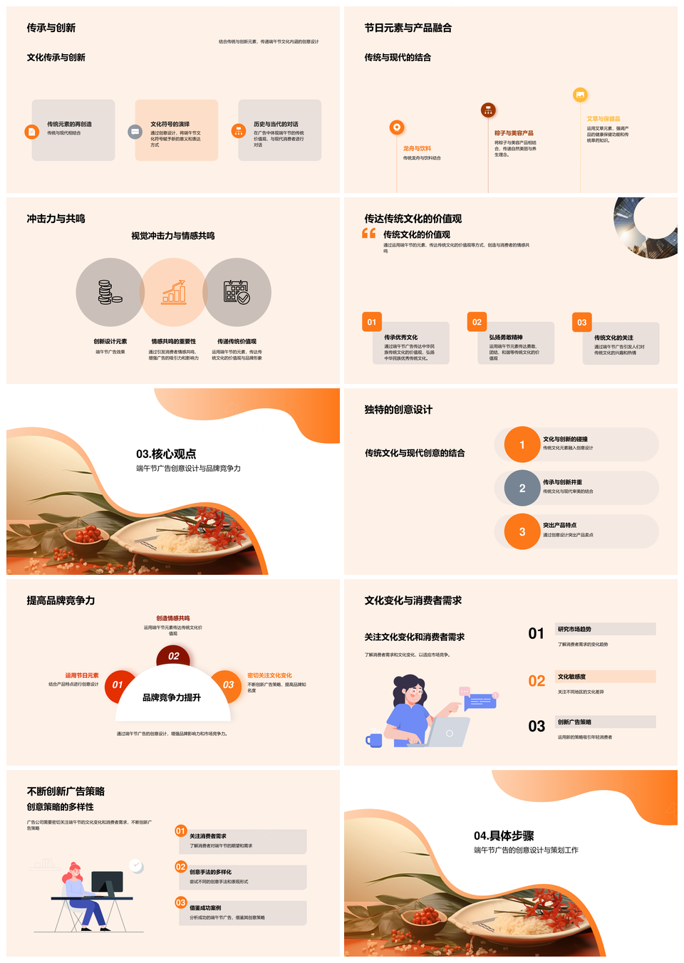 这是一张端午节创意设计广告策划龙舟传统习俗文化内涵PPT模板,包含端午节、创意设计、广告策划、龙舟、传统习俗、文化内涵等主题内容,也可用作端午节创意设计广告策划、端午节龙舟传统习俗文化、龙舟传统习俗文化内涵、创意设计广告策划龙舟、端午节课广告策划龙舟、传统习俗文化内涵、龙舟传统习俗文化、端午节创意设计广告、端午节课传统习俗、创意设计广告策划、广告策划龙舟传统、习俗文化内涵、端午节龙舟传统、端午节创意策划、龙舟习俗文化等PPT场景使用。 风云办公提供的端午节创意设计广告策划龙舟传统习俗文化内涵PPT模板,下载格式为pptx,一共22页,作品中文字及图均可以修改和编辑,图片更改请在作品中右键图片并更换,文字修改请直接点击文字进行修改。