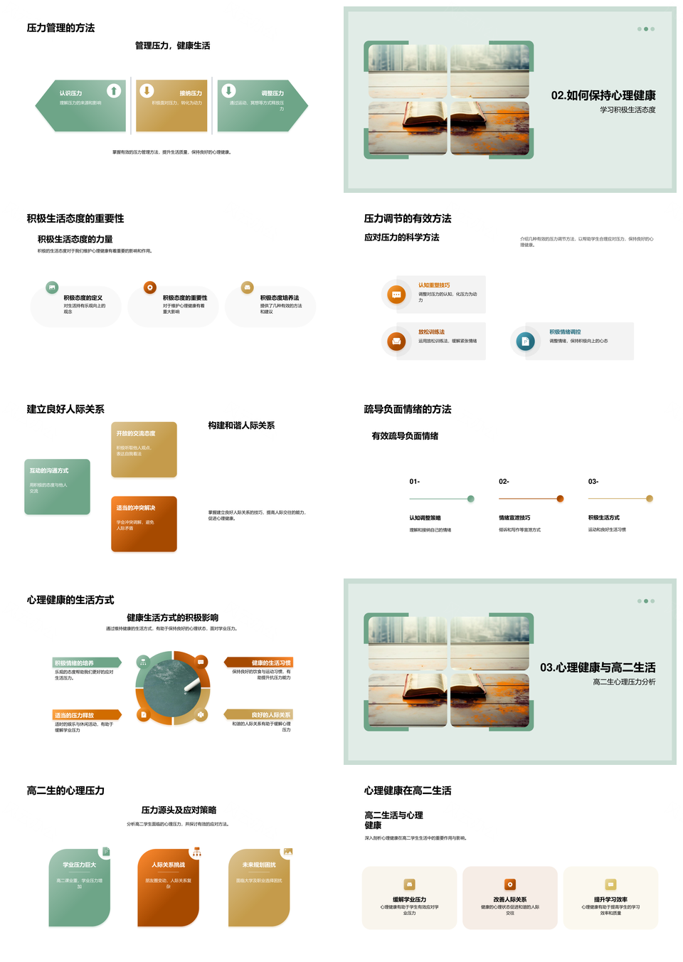 风云办公提供的高二学生心理健康与学业压力调适PPT模板,下载格式为pptx,一共33页,作品中文字及图均可以修改和编辑,图片更改请在作品中右键图片并更换,文字修改请直接点击文字进行修改。