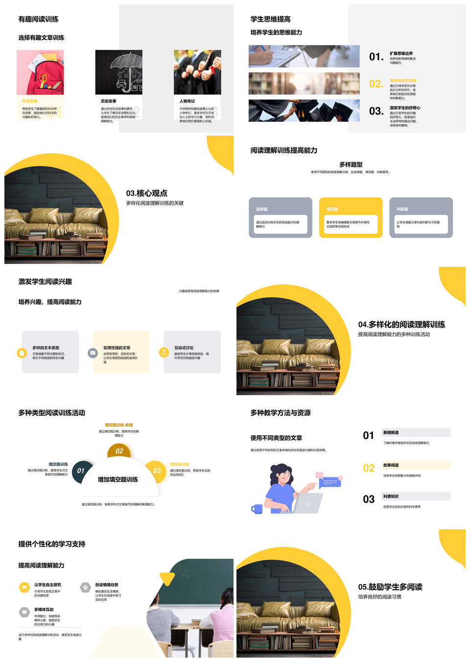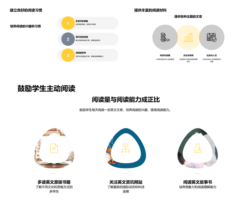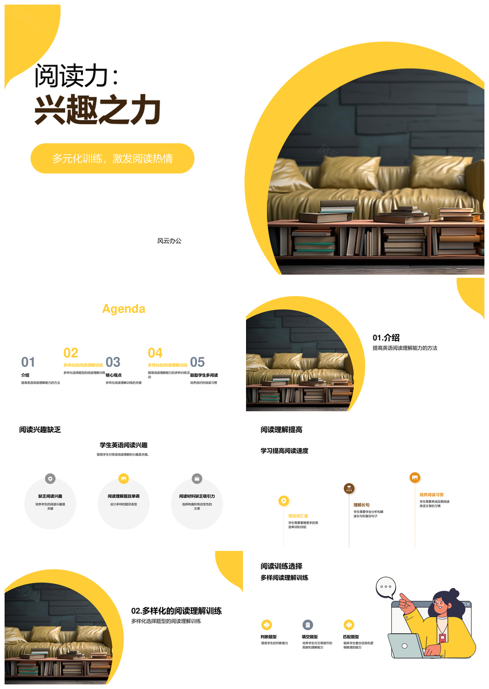 风云办公提供的初中英语阅读兴趣能力训练提高PPT模板,下载格式为pptx,一共21页,作品中文字及图均可以修改和编辑,图片更改请在作品中右键图片并更换,文字修改请直接点击文字进行修改。