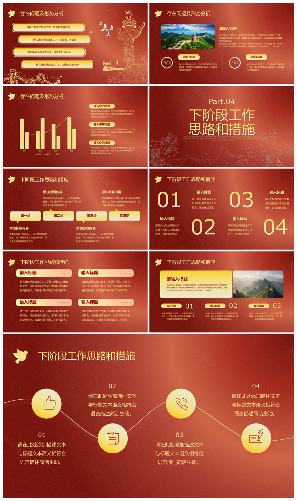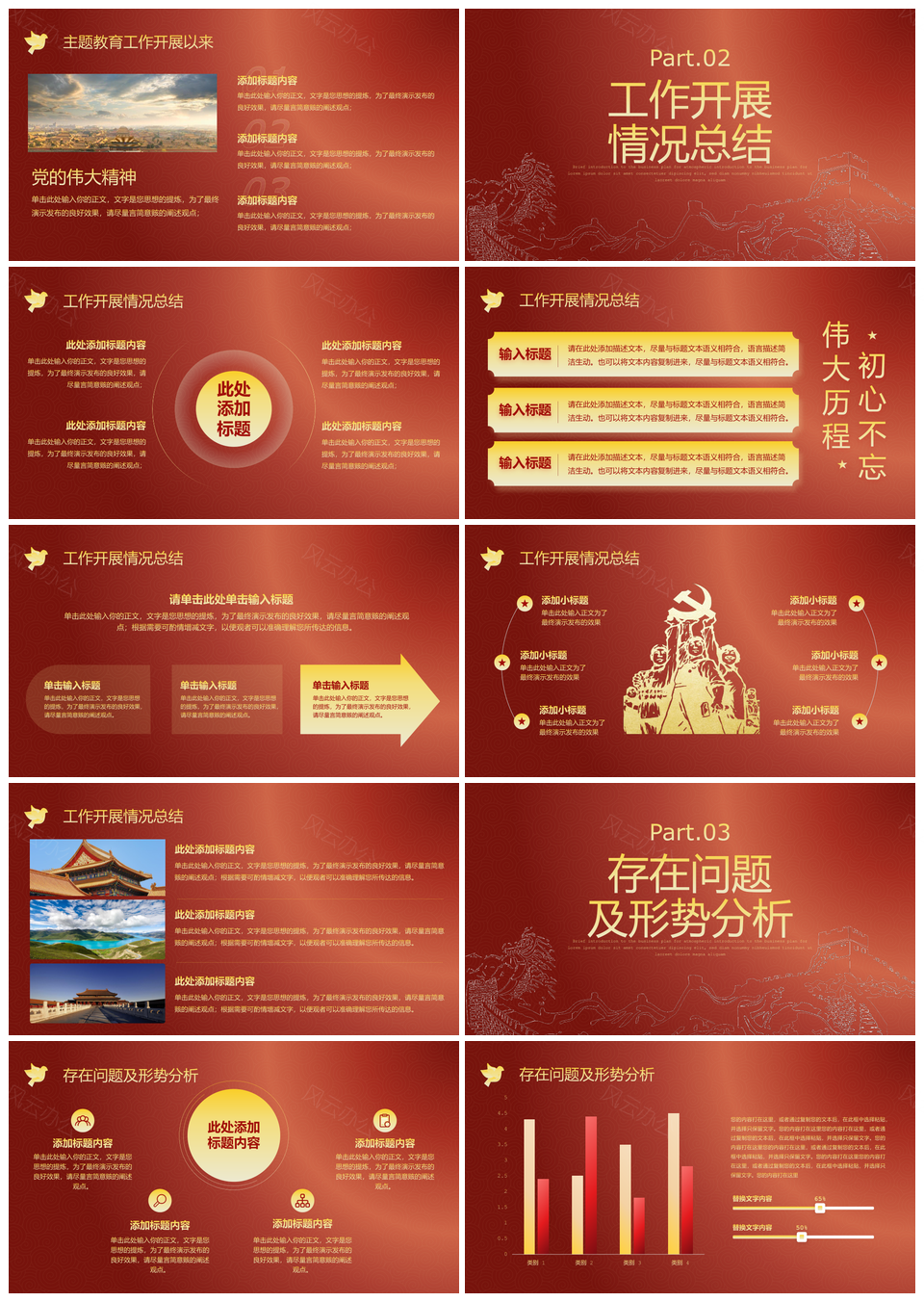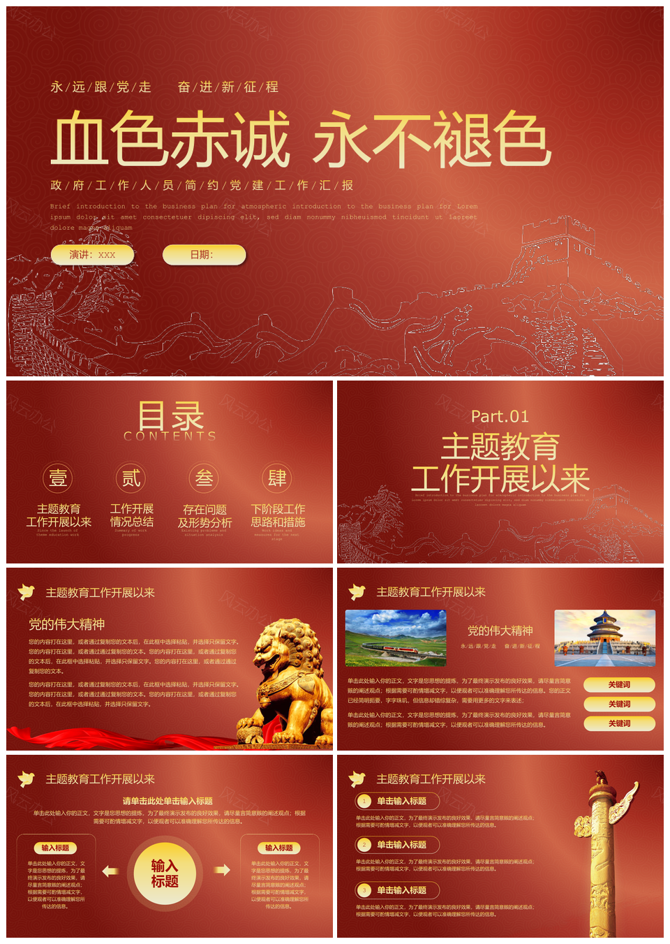 红底长城简约风政府党建述职主题教育汇报总结PPT模板推荐