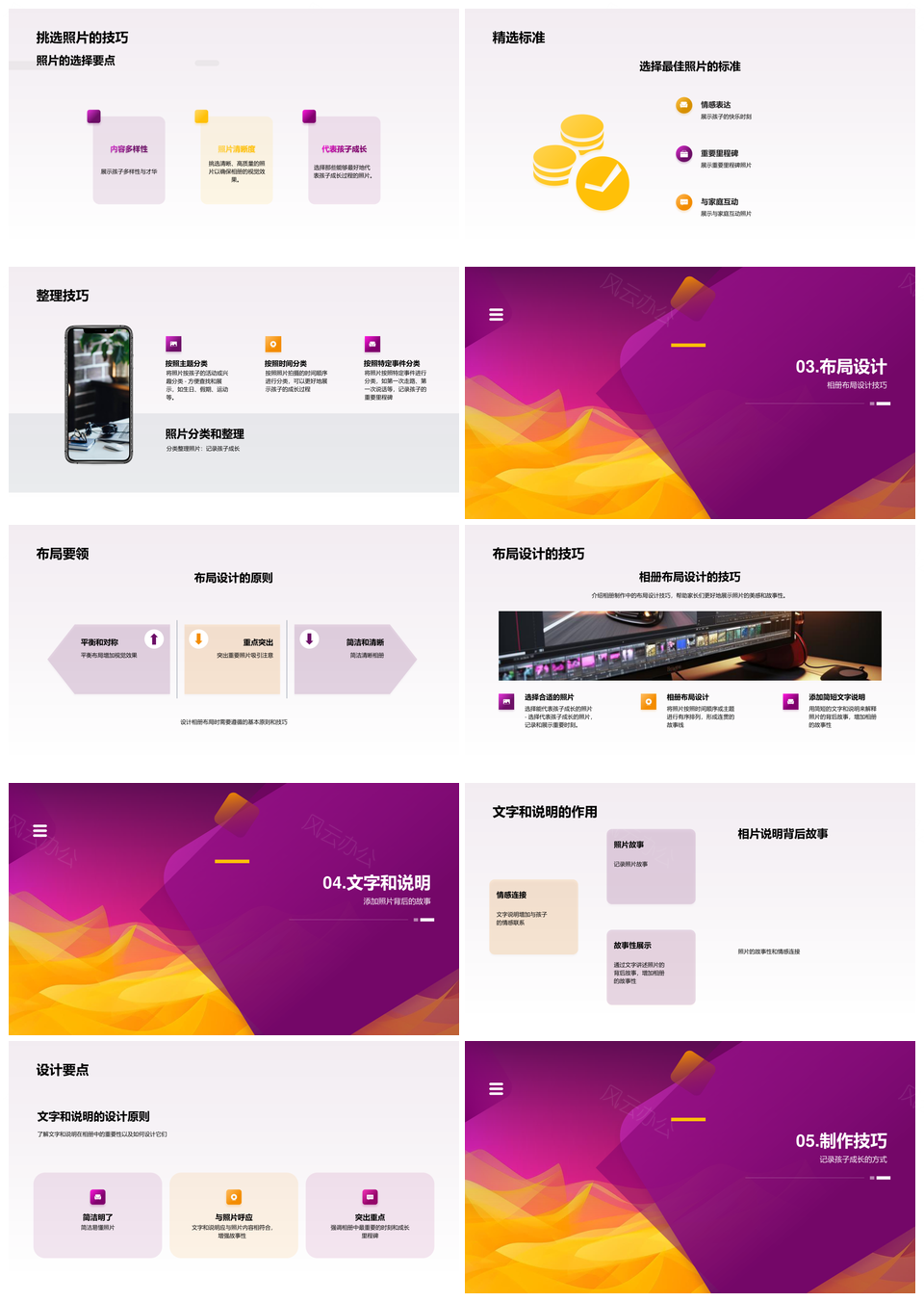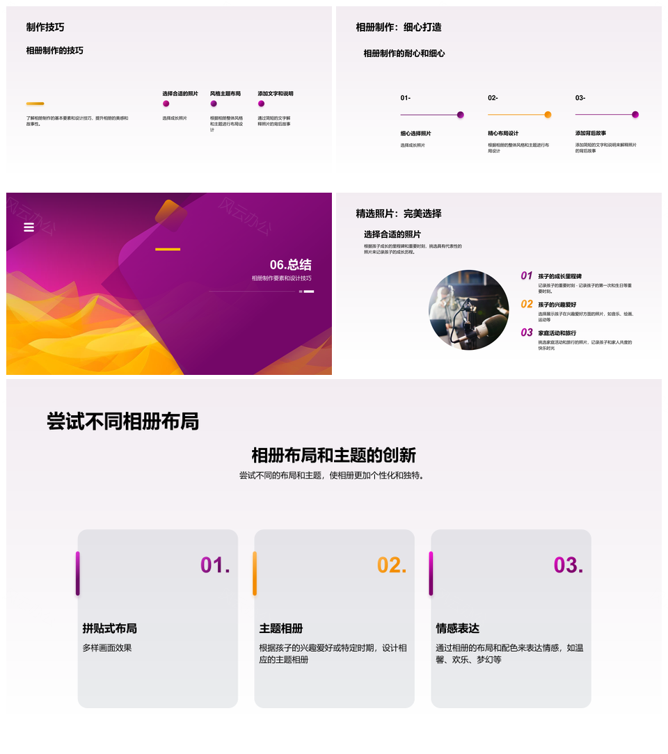 这是一张儿童相册制作指南PPT模板,包含儿童、相册、制作、指南等主题内容,也可用作儿童相册制作指南、儿童相册制作、儿童相册指南、相册制作指南、儿童制作指南、相册制作、制作指南、儿童相册、儿童制作、儿童指南、相册指南、制作儿童相册、指南制作相册、儿童相册制作、相册儿童指南等PPT场景使用。 风云办公提供的儿童相册制作指南PPT模板,下载格式为pptx,一共23页,作品中文字及图均可以修改和编辑,图片更改请在作品中右键图片并更换,文字修改请直接点击文字进行修改。