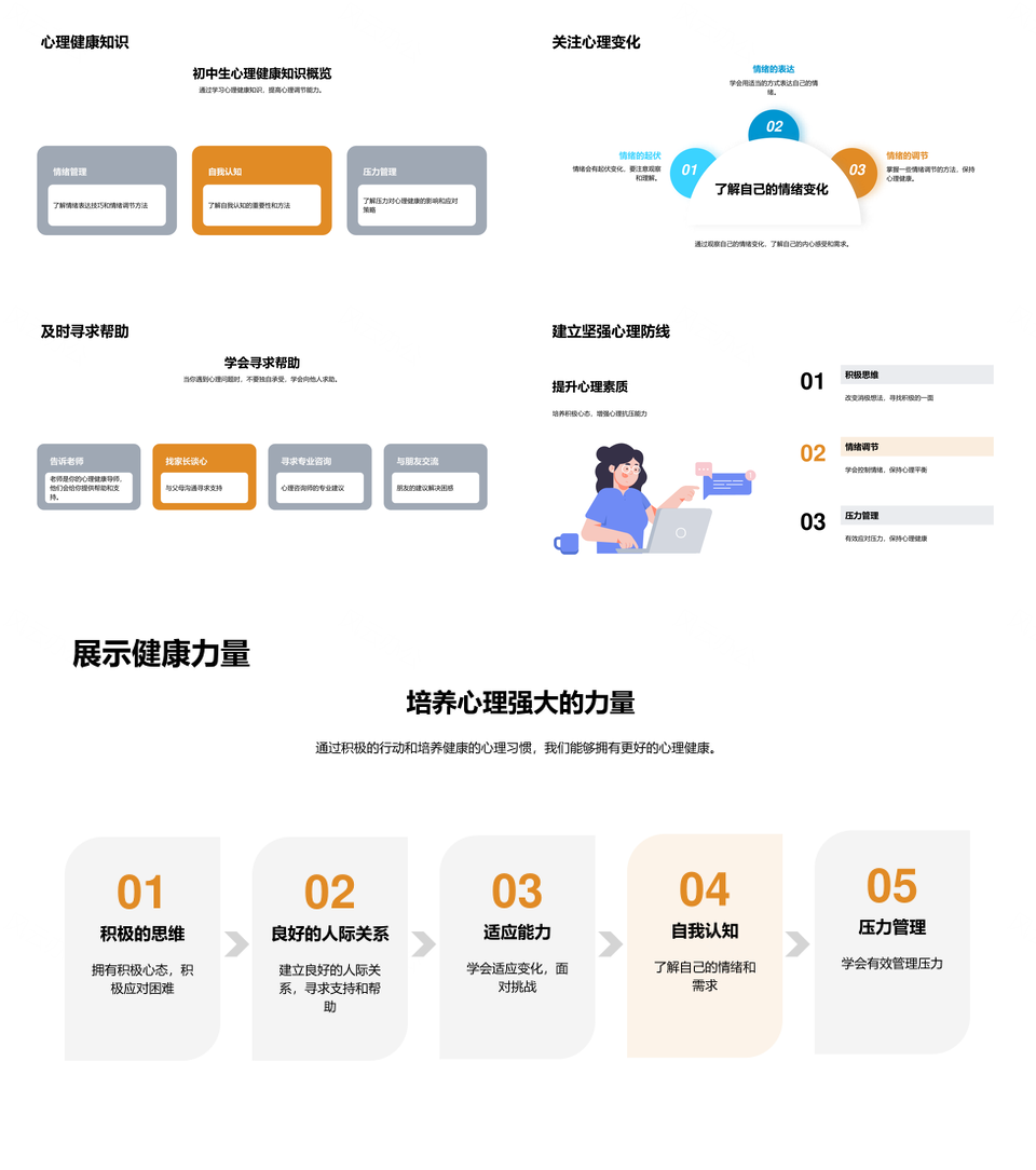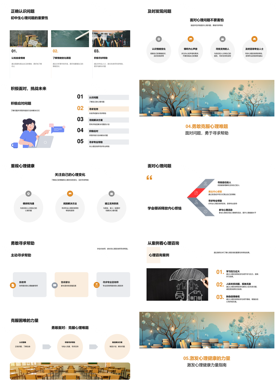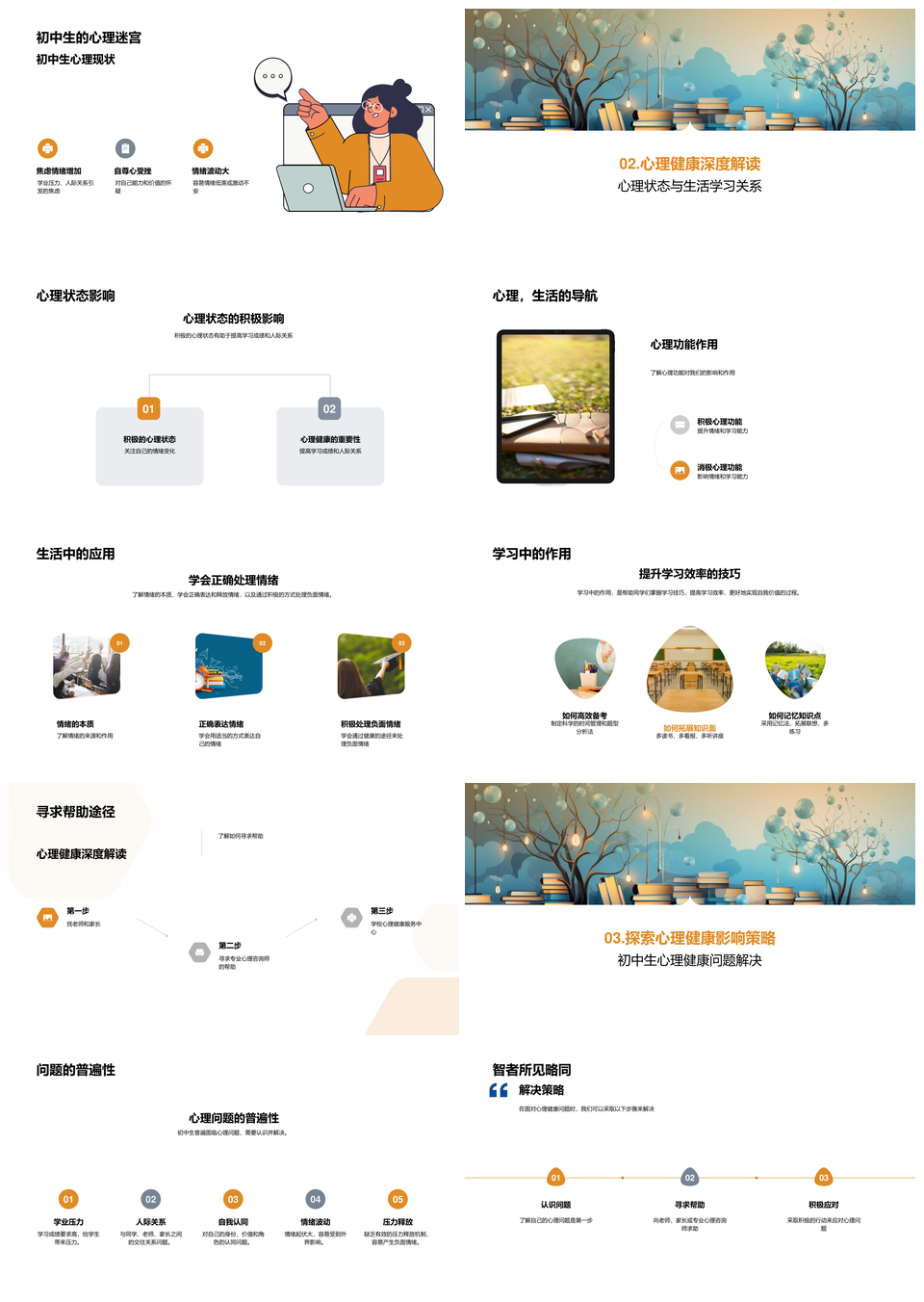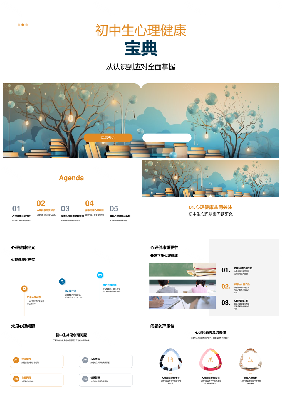 风云办公提供的初中生心理健康定义重要性及应对指南PPT模板,下载格式为pptx,一共33页,作品中文字及图均可以修改和编辑,图片更改请在作品中右键图片并更换,文字修改请直接点击文字进行修改。