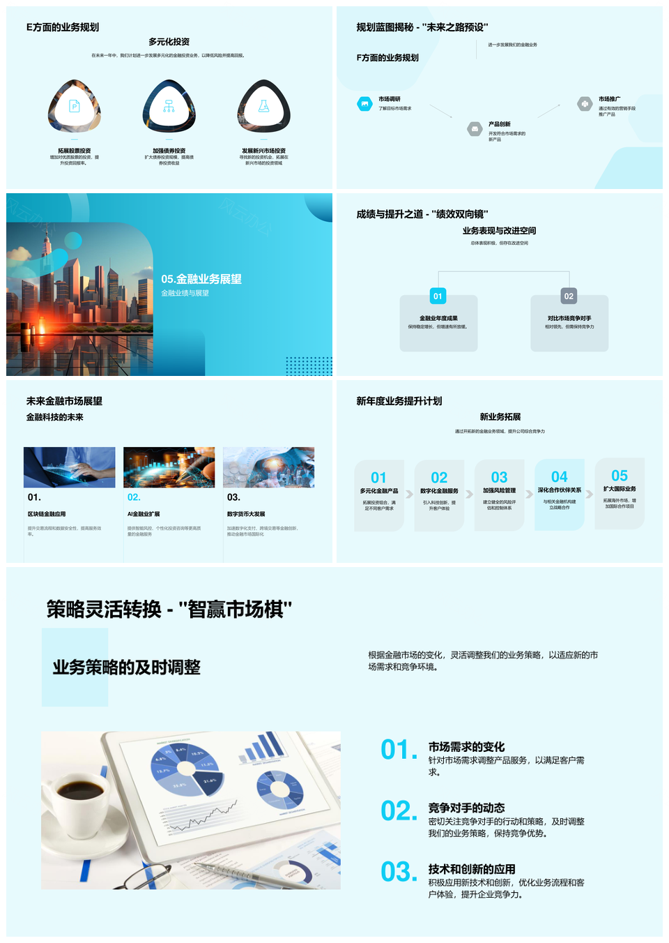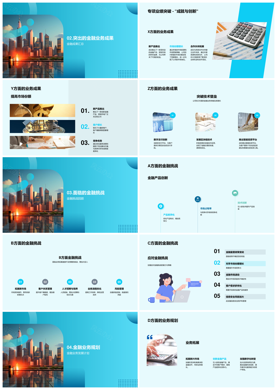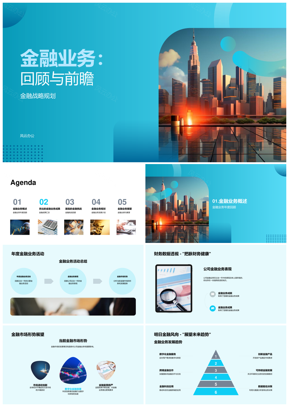 风云办公提供的金融业务年度回顾与摩天大楼展望PPT模板,下载格式为pptx,一共25页,作品中文字及图均可以修改和编辑,图片更改请在作品中右键图片并更换,文字修改请直接点击文字进行修改。