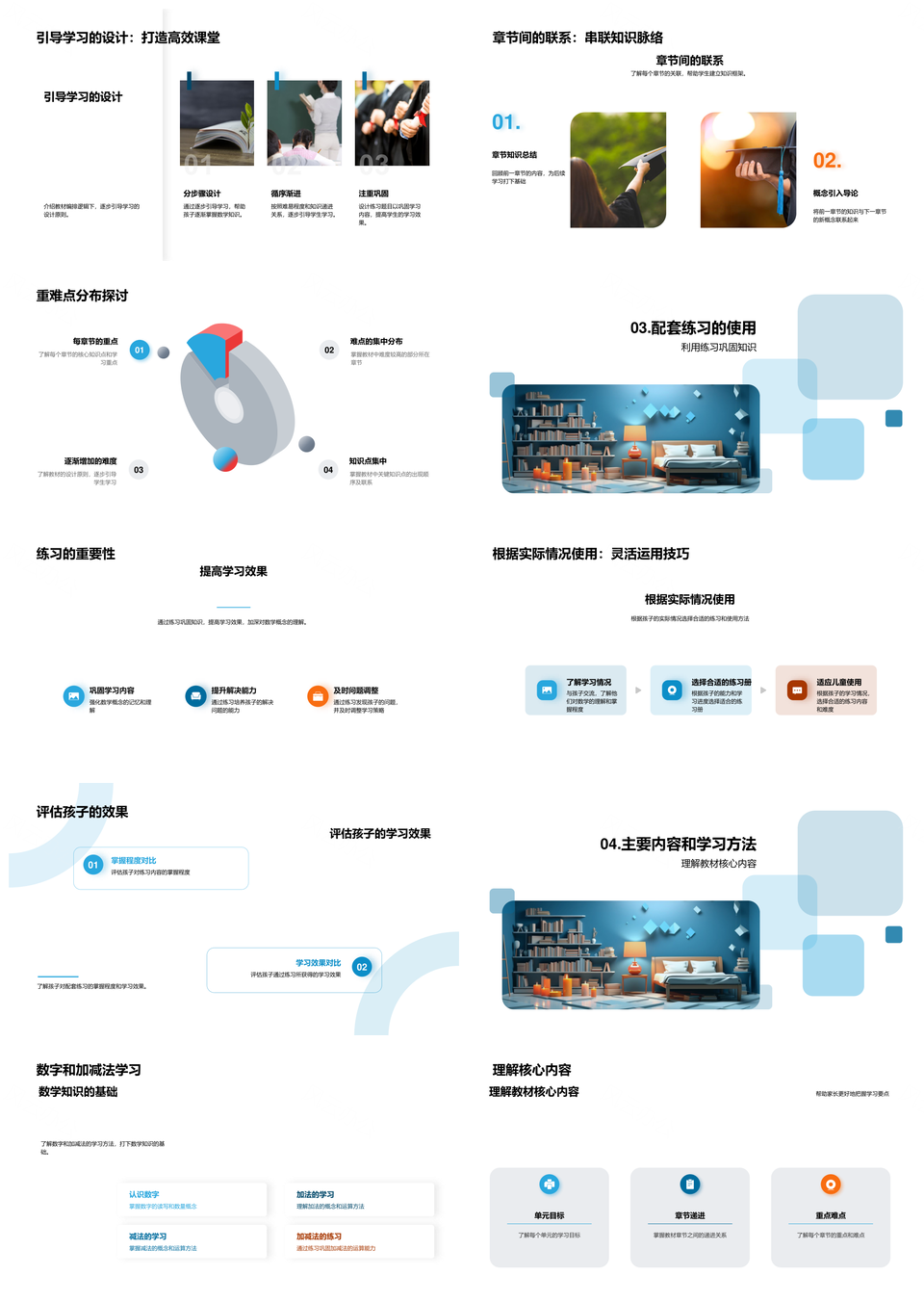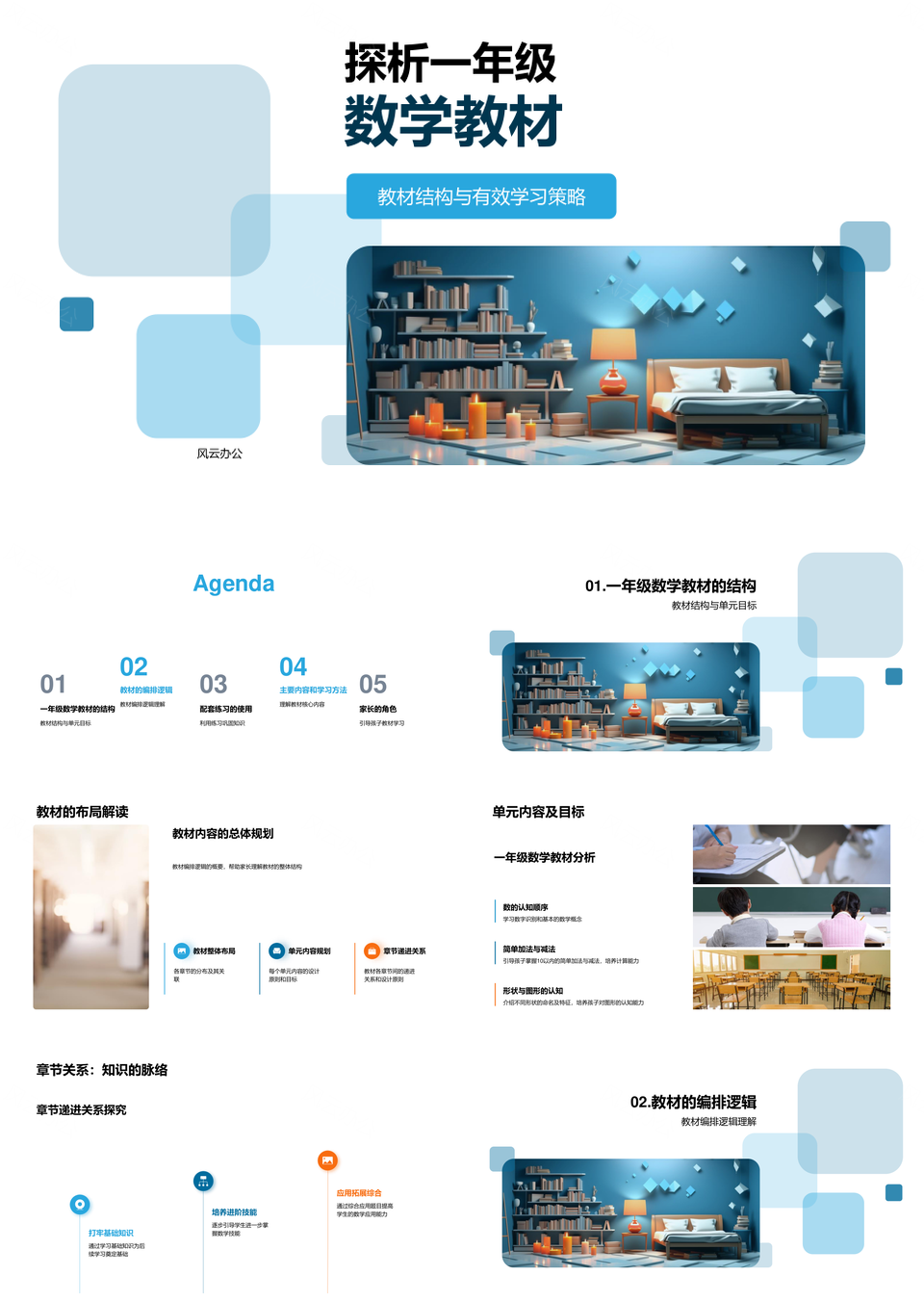 风云办公提供的一年级数学教材结构策略与章节递进PPT模板,下载格式为pptx,一共23页,作品中文字及图均可以修改和编辑,图片更改请在作品中右键图片并更换,文字修改请直接点击文字进行修改。