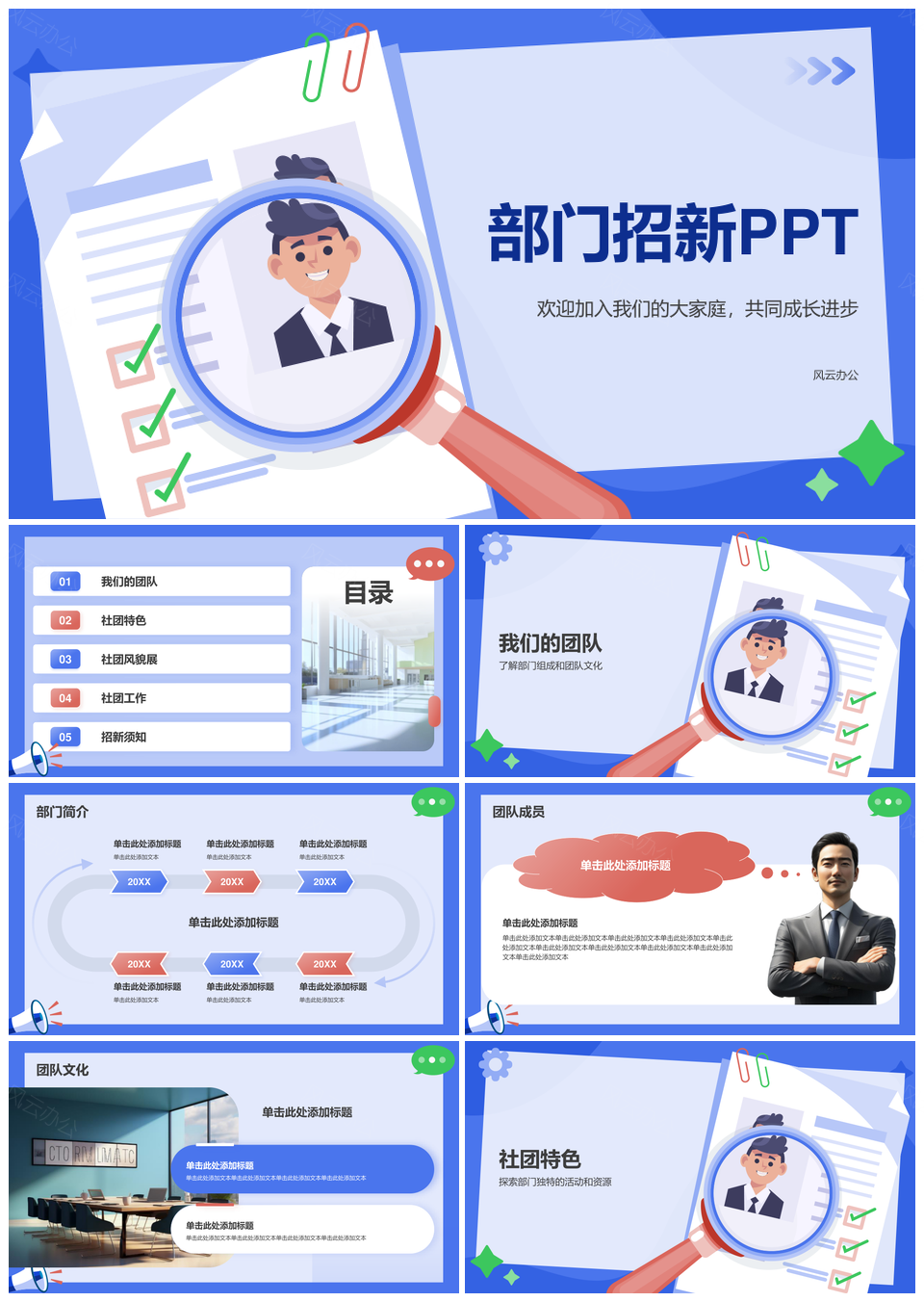 风云办公提供的社团招新PPT团队特色风貌工作指南,下载格式为pptx,一共24页,作品中文字及图均可以修改和编辑,图片更改请在作品中右键图片并更换,文字修改请直接点击文字进行修改。