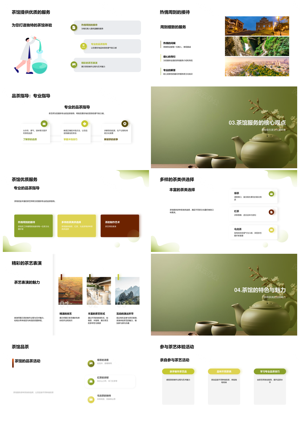 风云办公提供的茶馆服务特色茶文化魅力绿茶红茶茶壶PPT模板,下载格式为pptx,一共19页,作品中文字及图均可以修改和编辑,图片更改请在作品中右键图片并更换,文字修改请直接点击文字进行修改。