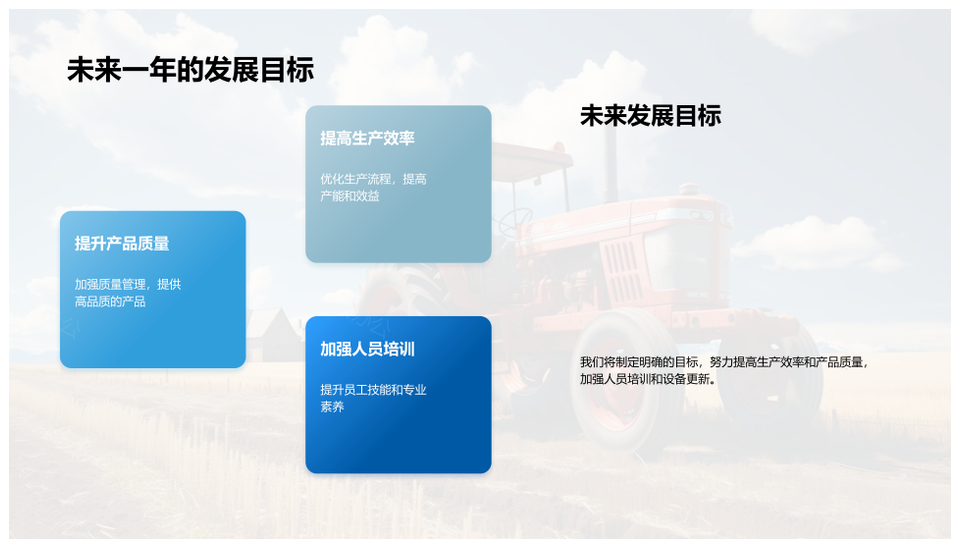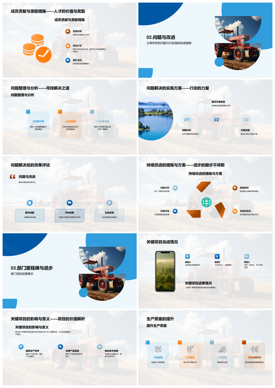 这是一张农业部门目标完成小麦田项目质效提升问题改进PPT模板,包含农业部门、目标、完成、小麦田、项目、质效、提升、问题、改进等主题内容,也可用作农业部门目标完成小麦田项目、目标完成小麦田项目质效提升、完成小麦田项目质效提升问题改进、农业部门目标完成质效提升、目标完成质效提升问题改进、农业部门质效提升问题改进、农业部门目标完成、目标完成小麦田项目、完成小麦田项目质效提升、小麦田项目质效提升问题改进、农业部门目标质效提升、农业部门小麦田项目质效提升、农业部门完成质效提升、目标质效提升问题改进、质效提升问题改进等PPT场景使用。 风云办公提供的农业部门目标完成小麦田项目质效提升问题改进PPT模板,下载格式为pptx,一共29页,作品中文字及图均可以修改和编辑,图片更改请在作品中右键图片并更换,文字修改请直接点击文字进行修改。