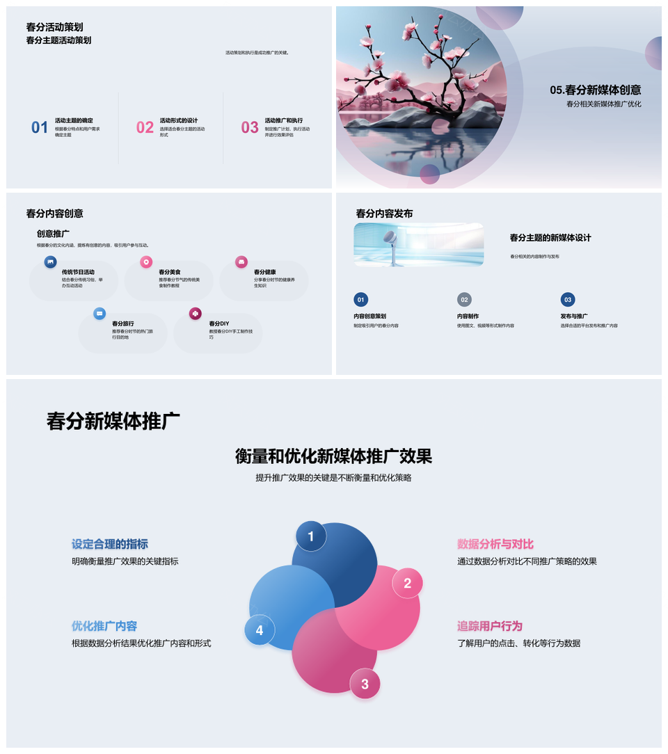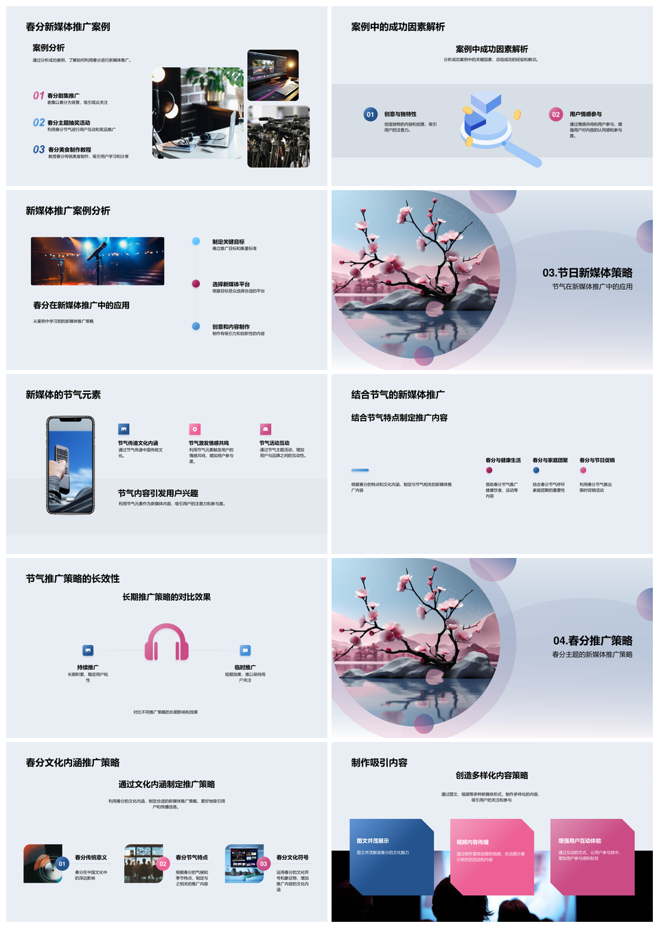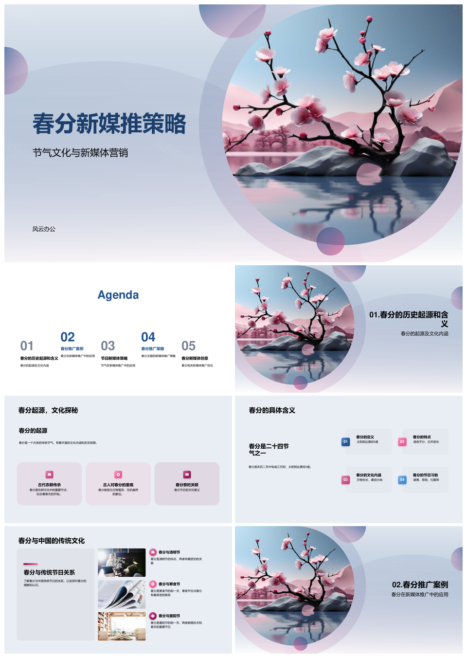 风云办公提供的春分节气新媒体营销樱花案例创意策略PPT模板,下载格式为pptx,一共23页,作品中文字及图均可以修改和编辑,图片更改请在作品中右键图片并更换,文字修改请直接点击文字进行修改。