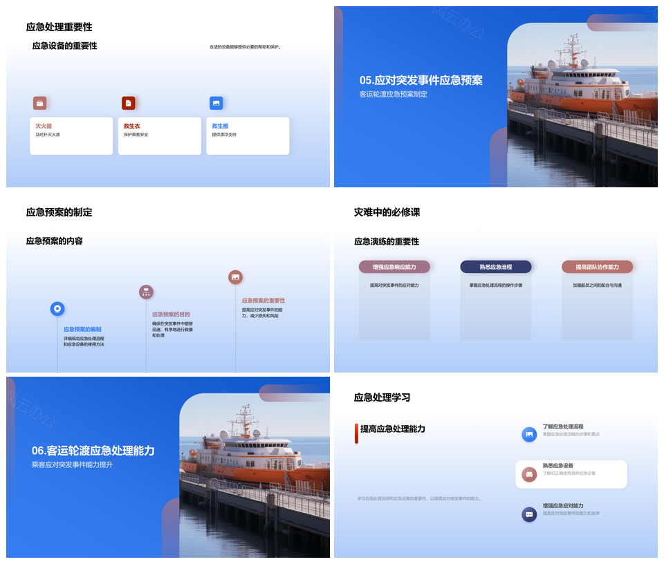 这是一张客运轮渡船员应急处理突发事件灭火救援抢救伤员PPT模板,包含客运轮渡、船员、应急处理、突发事件、灭火、救援、抢救、伤员等主题内容,也可用作客运轮渡船员应急处理、船员应急处理突发事件、应急处理突发事件灭火、处理突发事件灭火救援、突发事件灭火救援抢救、灭火救援抢救伤员、客运轮渡船员应急、船员应急处理、应急处理突发事件、处理突发事件灭火、突发事件灭火救援、灭火救援抢救、救援抢救伤员、客运轮渡、轮渡船员等PPT场景使用。 风云办公提供的客运轮渡船员应急处理突发事件灭火救援抢救伤员PPT模板,下载格式为pptx,一共24页,作品中文字及图均可以修改和编辑,图片更改请在作品中右键图片并更换,文字修改请直接点击文字进行修改。