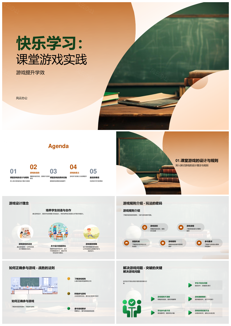 风云办公提供的快乐学习课堂游戏寓教于乐提升学效PPT模板,下载格式为pptx,一共24页,作品中文字及图均可以修改和编辑,图片更改请在作品中右键图片并更换,文字修改请直接点击文字进行修改。
