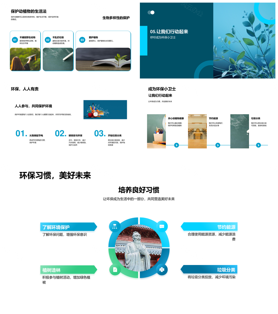 这是一张小学环保课程行动共筑绿色未来PPT模板,包含小学、环保课程、行动、共筑、绿色未来等主题内容,也可用作小学环保课程行动、行动共筑绿色未来、小学环保课程、环保课程行动、共筑绿色未来、小学环保行动、小学环保、环保课程、课程行动、行动共筑、共筑绿色、绿色未来、环保行动、共筑未来、环保共筑未来等PPT场景使用。 风云办公提供的小学环保课程行动共筑绿色未来PPT模板,下载格式为pptx,一共23页,作品中文字及图均可以修改和编辑,图片更改请在作品中右键图片并更换,文字修改请直接点击文字进行修改。