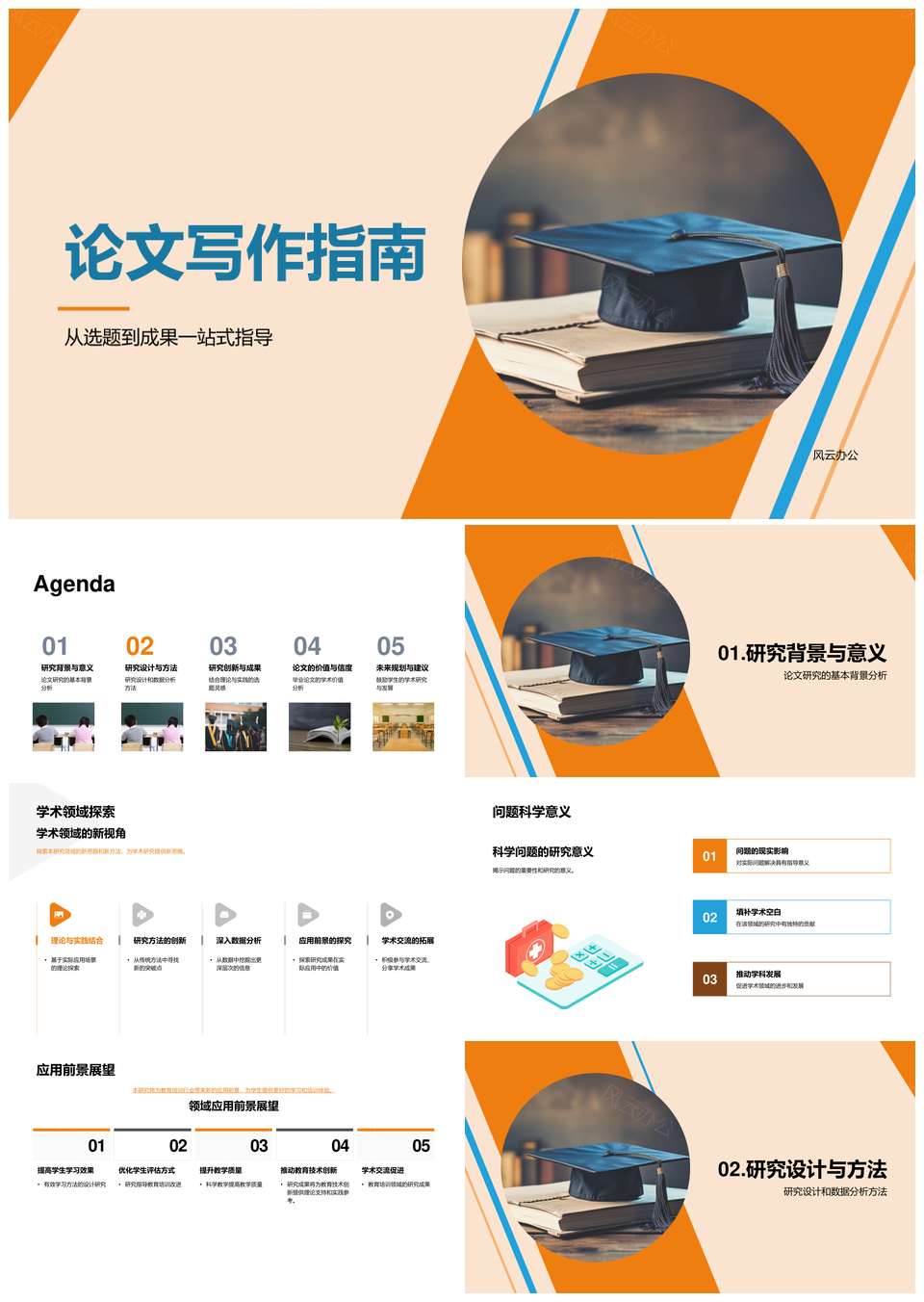 风云办公提供的论文写作研究方法与创新应用指南PPT模板,下载格式为pptx,一共23页,作品中文字及图均可以修改和编辑,图片更改请在作品中右键图片并更换,文字修改请直接点击文字进行修改。