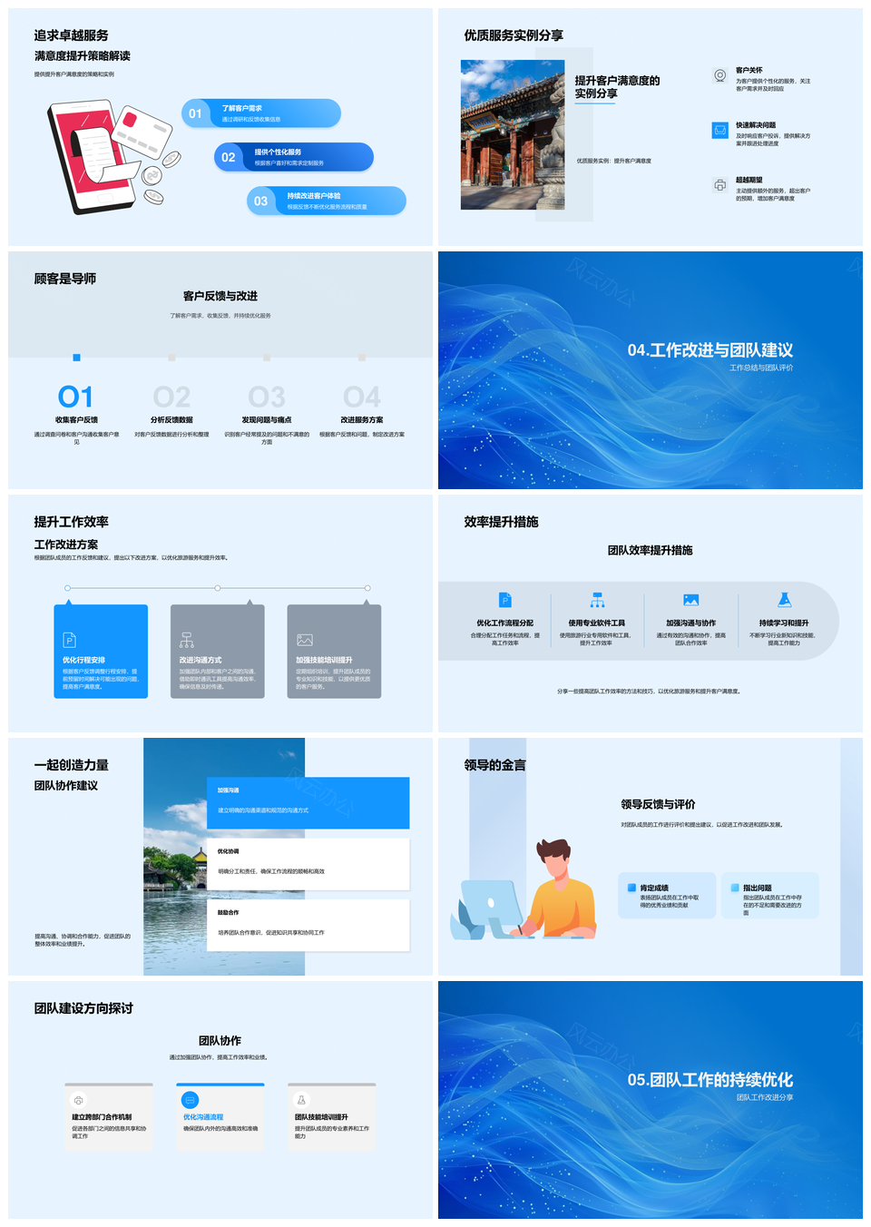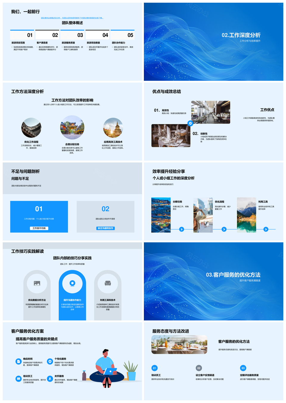 这是一张旅游业绩月报团队服务效率客户满意度分析改进PPT模板,包含旅游、业绩、月报、团队、服务、效率、客户、满意度、分析、改进等主题内容,也可用作旅游业绩月报团队、团队服务效率客户、服务效率客户满意度、效率客户满意度分析、客户满意度分析改进、团队服务效率分析、服务效率分析改进、旅游业绩月报、月报团队服务、团队服务效率、服务效率客户、客户满意度分析、满意度分析改进、分析改进、效率分析改进等PPT场景使用。 风云办公提供的旅游业绩月报团队服务效率客户满意度分析改进PPT模板,下载格式为pptx,一共33页,作品中文字及图均可以修改和编辑,图片更改请在作品中右键图片并更换,文字修改请直接点击文字进行修改。