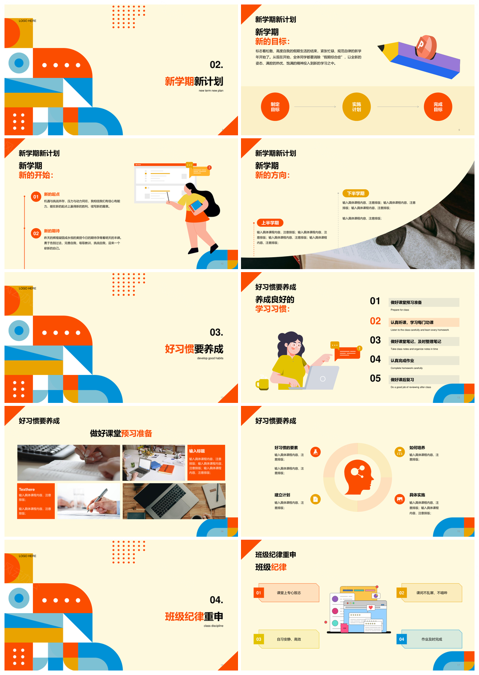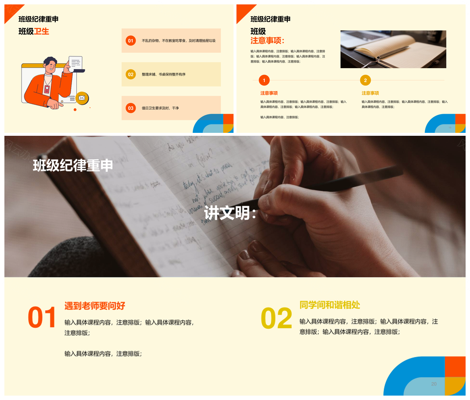 这是一张橙色插画简约扁平校园开学收心主题班会PPT模板,包含橙色、插画、简约、扁平、校园、开学、收心、主题、班会等主题内容,也可用作橙色插画简约扁平校园开学收心主题班会、插画简约扁平校园开学收心、简约扁平校园开学收心主题班会、橙色插画简约扁平校园开学、插画简约扁平校园开学收心主题班会、扁平校园开学收心主题班会、橙色插画校园开学收心主题班会、插画简约校园开学收心、简约扁平开学收心主题班会、橙色插画主题班会、校园开学收心主题班会、橙色插画简约扁平、简约扁平校园开学、校园开学收心、开学收心主题班会等PPT场景使用。 风云办公提供的橙色插画简约扁平校园开学收心主题班会PPT模板,下载格式为pptx,一共21页,作品中文字及图均可以修改和编辑,图片更改请在作品中右键图片并更换,文字修改请直接点击文字进行修改。