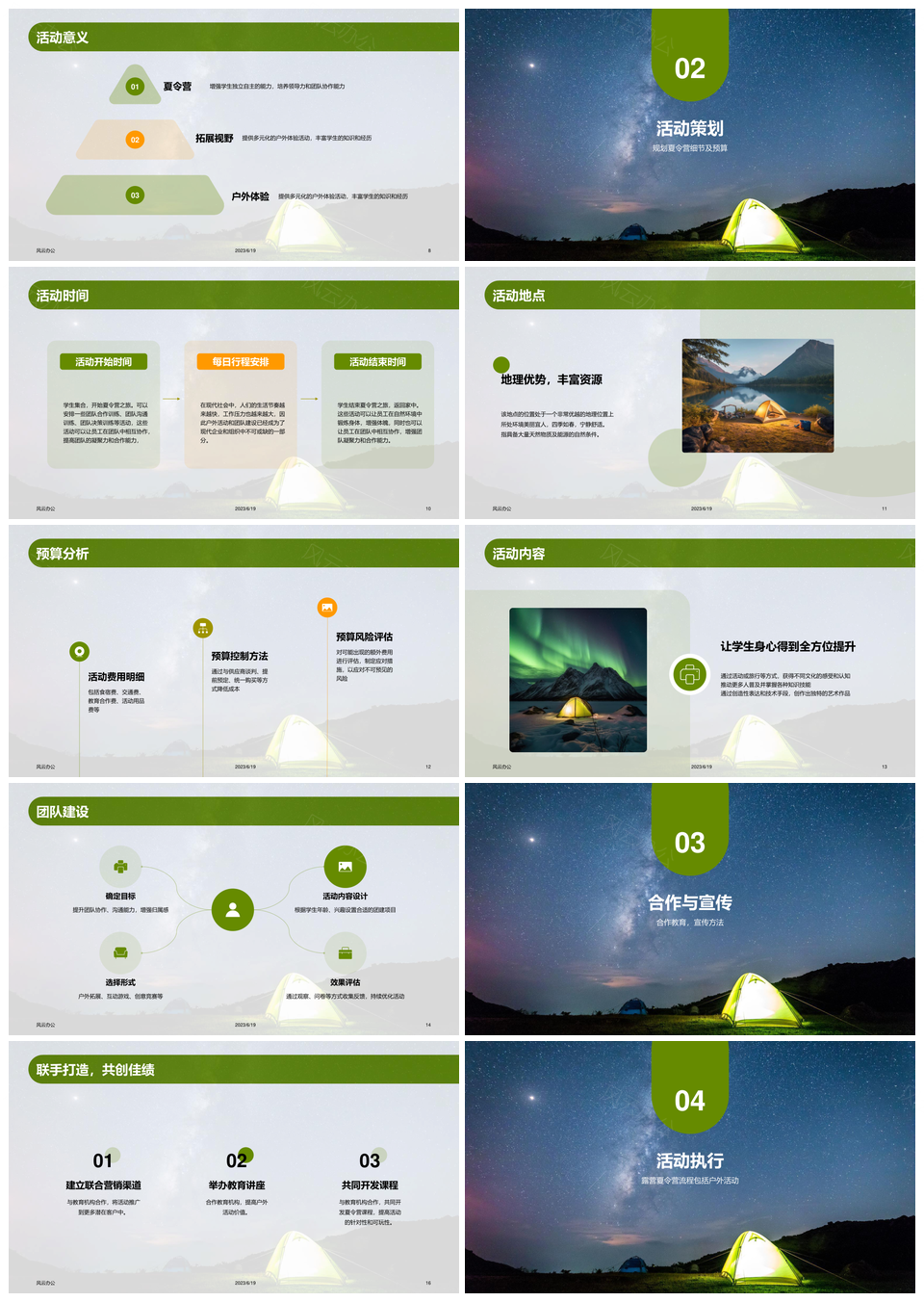 这是一张蓝绿商务帐篷露营夏令营CTR营销策划PPT模板,包含蓝绿、商务、帐篷、露营、夏令营、CTR、营销策划等主题内容,也可用作蓝绿商务帐篷露营、商务帐篷露营夏令营、帐篷露营夏令营CTR、露营夏令营CTR营销、夏令营CTR营销策划、蓝绿商务帐篷露营、商务帐篷露营夏令营、帐篷露营夏令营CTR、露营夏令营CTR营销、夏令营CTR营销策划、蓝绿商务帐篷、商务帐篷露营、帐篷露营夏令营、露营夏令营CTR、夏令营CTR营销等PPT场景使用。 风云办公提供的蓝绿商务帐篷露营夏令营CTR营销策划PPT模板,下载格式为pptx,一共22页,作品中文字及图均可以修改和编辑,图片更改请在作品中右键图片并更换,文字修改请直接点击文字进行修改。