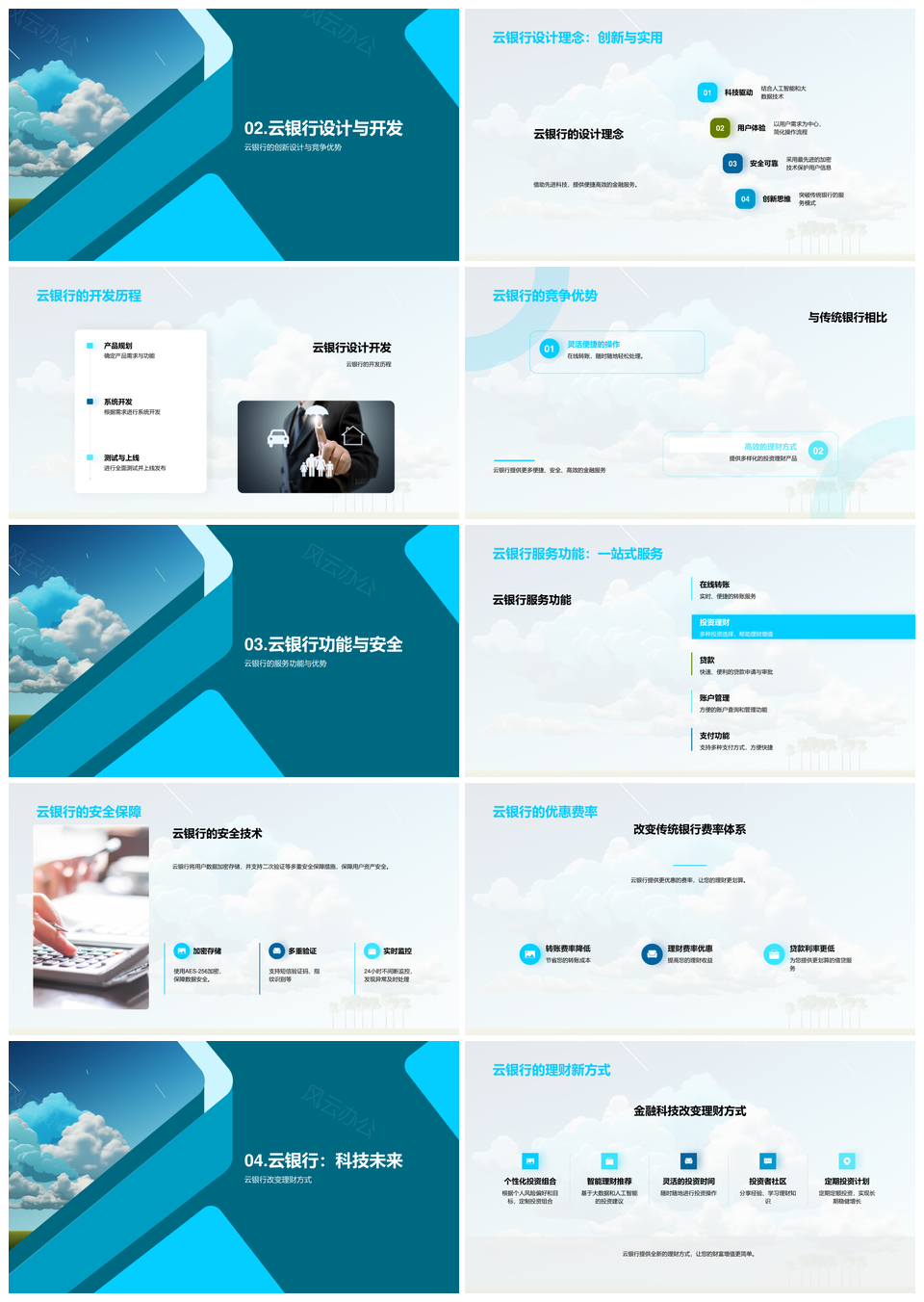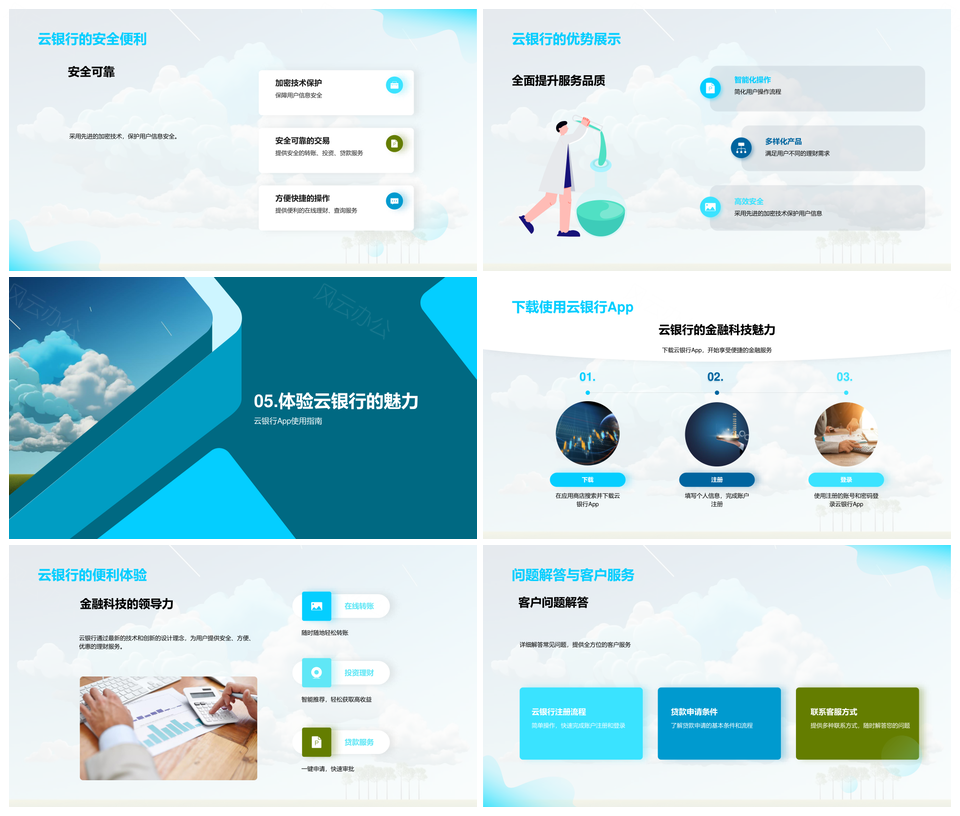 风云办公提供的云银行革新金融科技服务优势PPT模板,下载格式为pptx,一共24页,作品中文字及图均可以修改和编辑,图片更改请在作品中右键图片并更换,文字修改请直接点击文字进行修改。