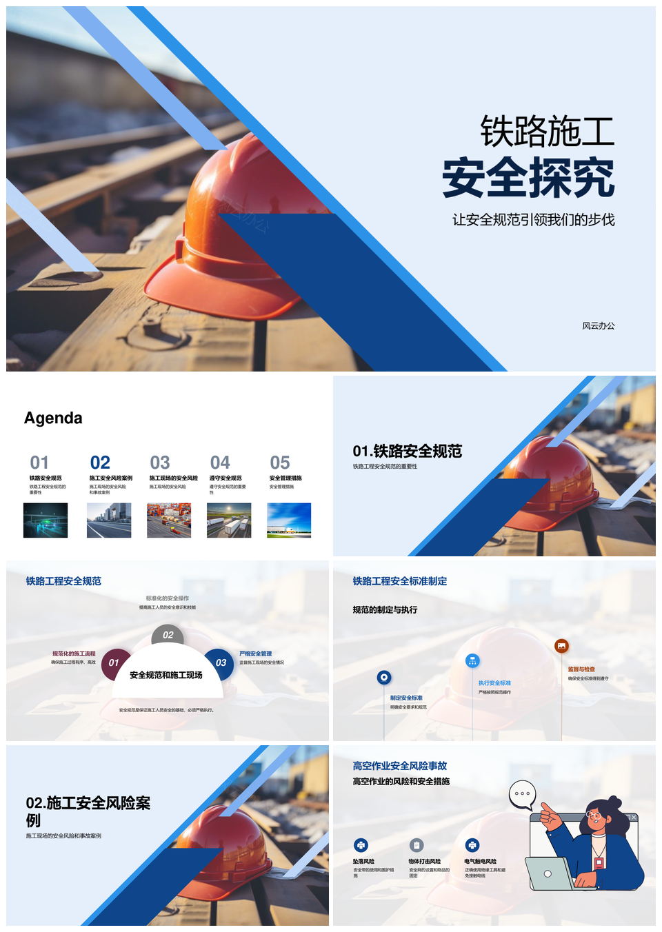 风云办公提供的铁路施工安全风险与管理规范PPT模板,下载格式为pptx,一共21页,作品中文字及图均可以修改和编辑,图片更改请在作品中右键图片并更换,文字修改请直接点击文字进行修改。
